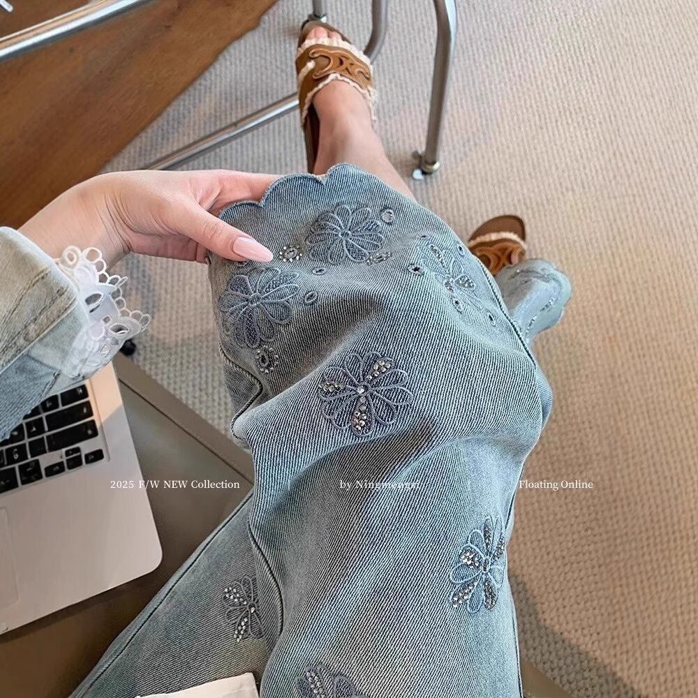 立体の花刺繍が大人可愛いシンプルなデニムパンツ。