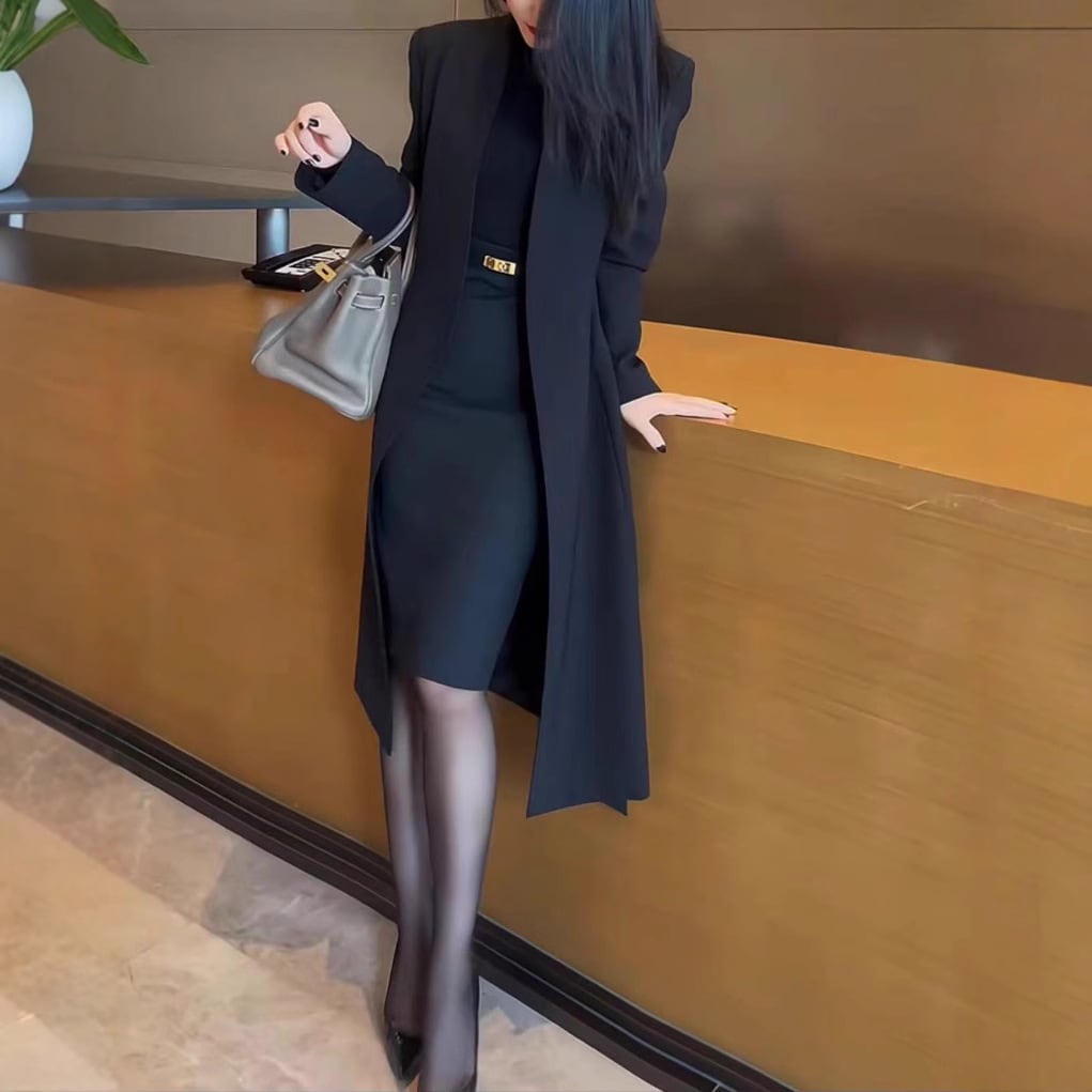大人エレガントなカットソー+スカート+コートのセットアップ。