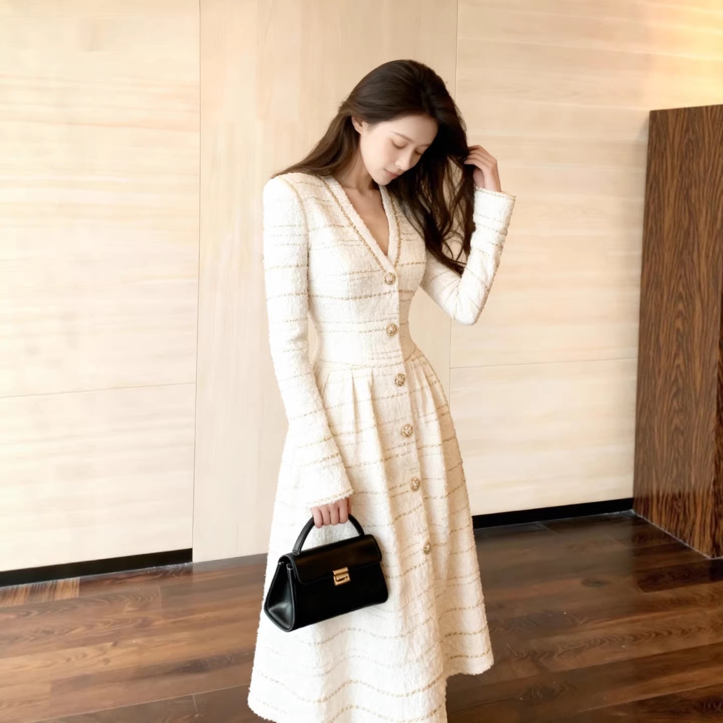 深めのvネックでデコルテラインを華奢に美しく。