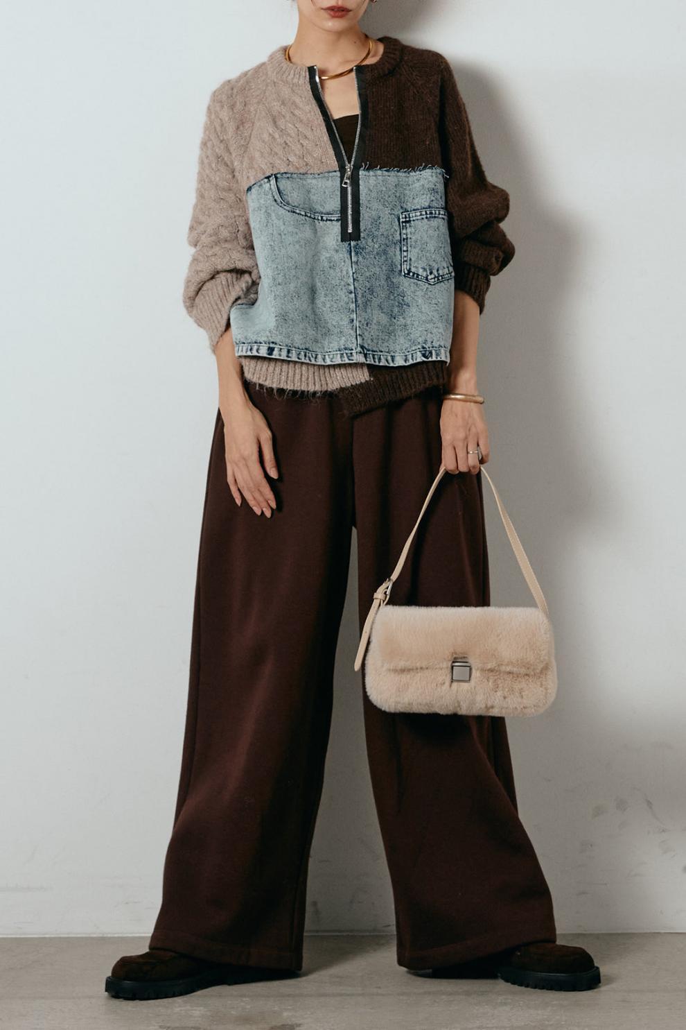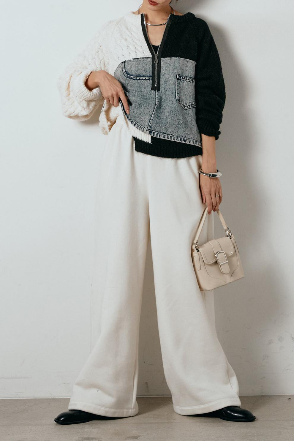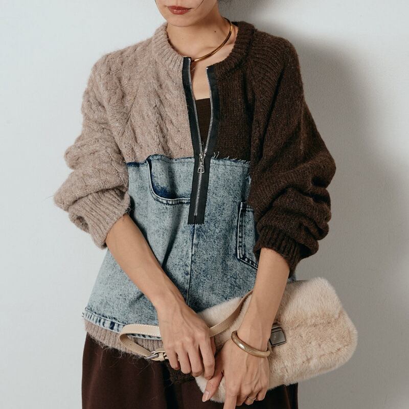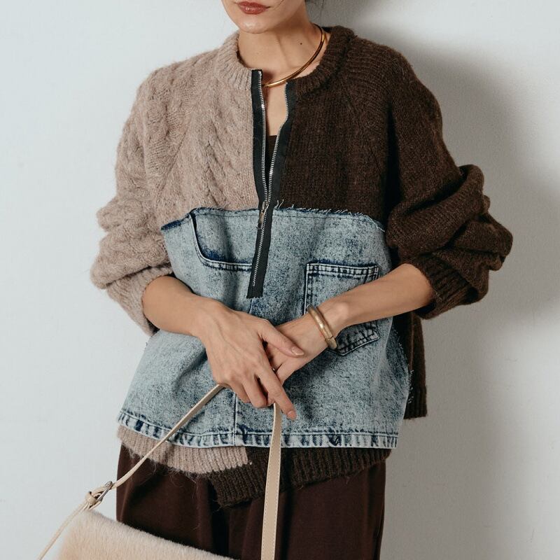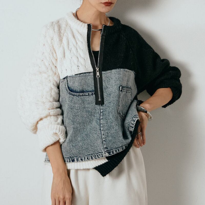 大人カジュアルなドッキングデニムニットセーター。