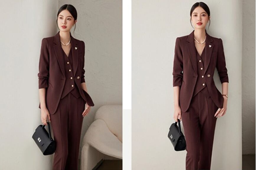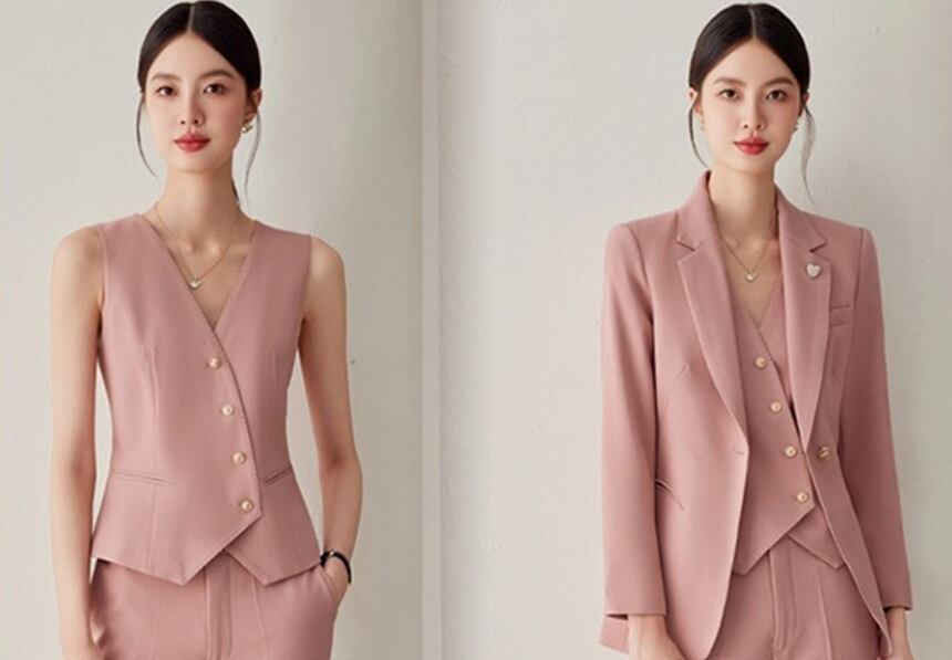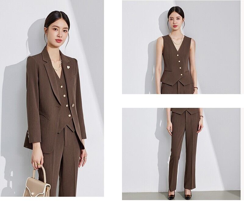 大人エレガントなジャケット+ジレ+パンツのセットアップスーツ。