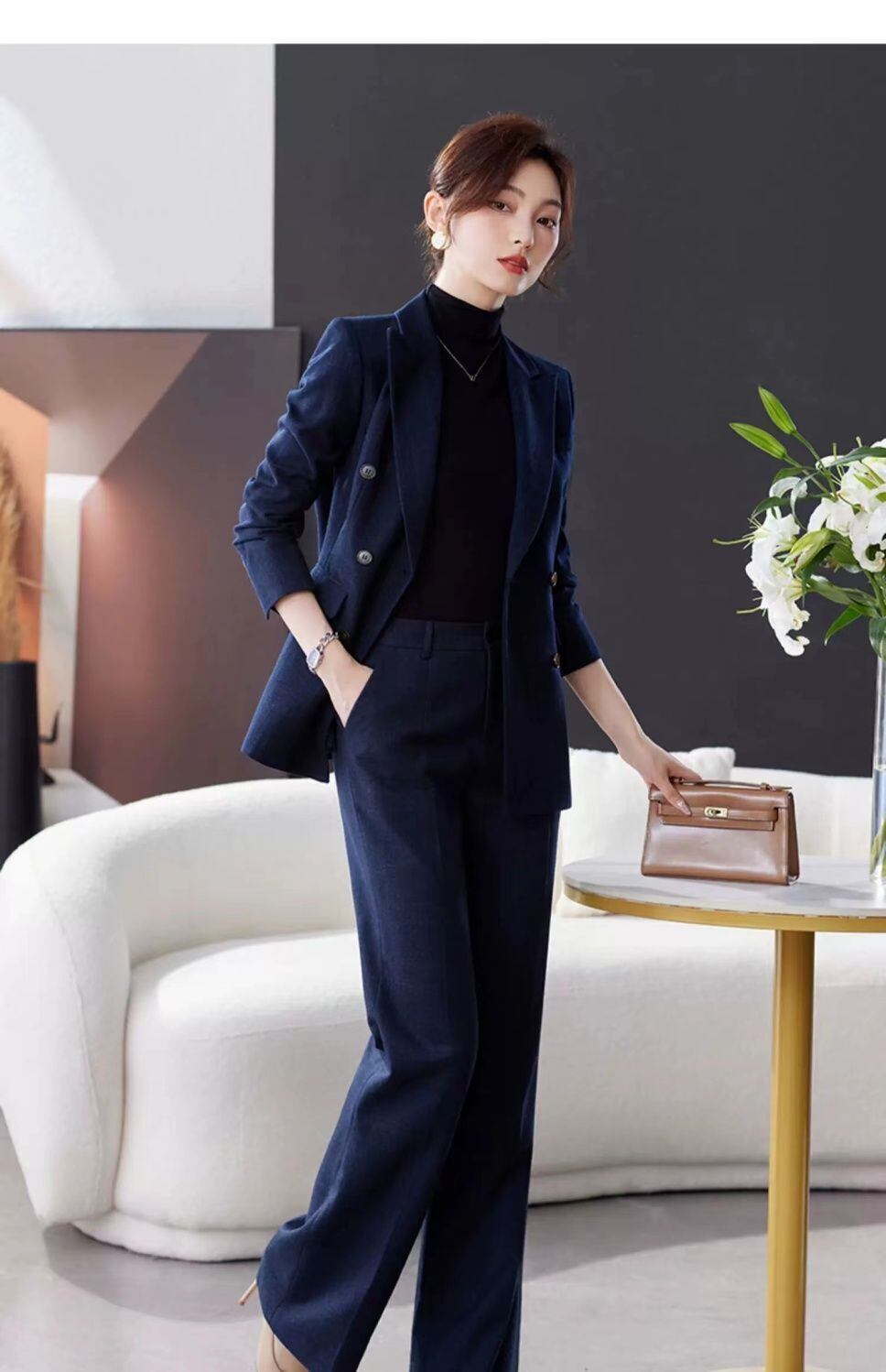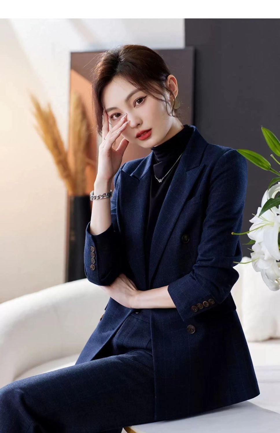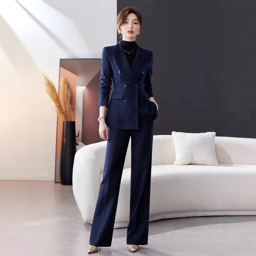 大人エレガントなチェック柄ジャケット+ワイドパンツのセットアップスーツ。