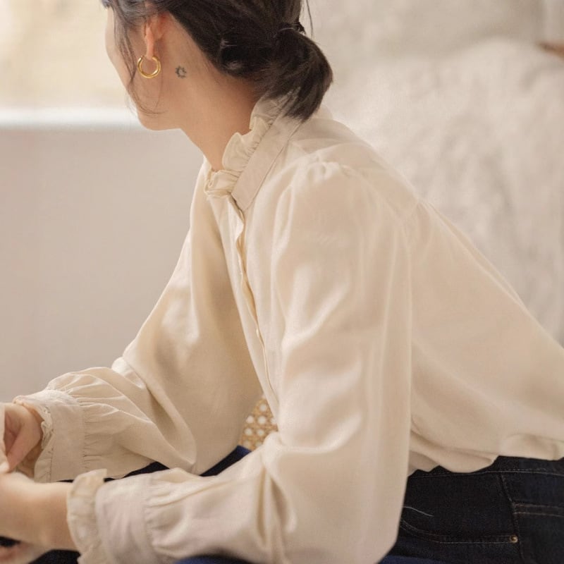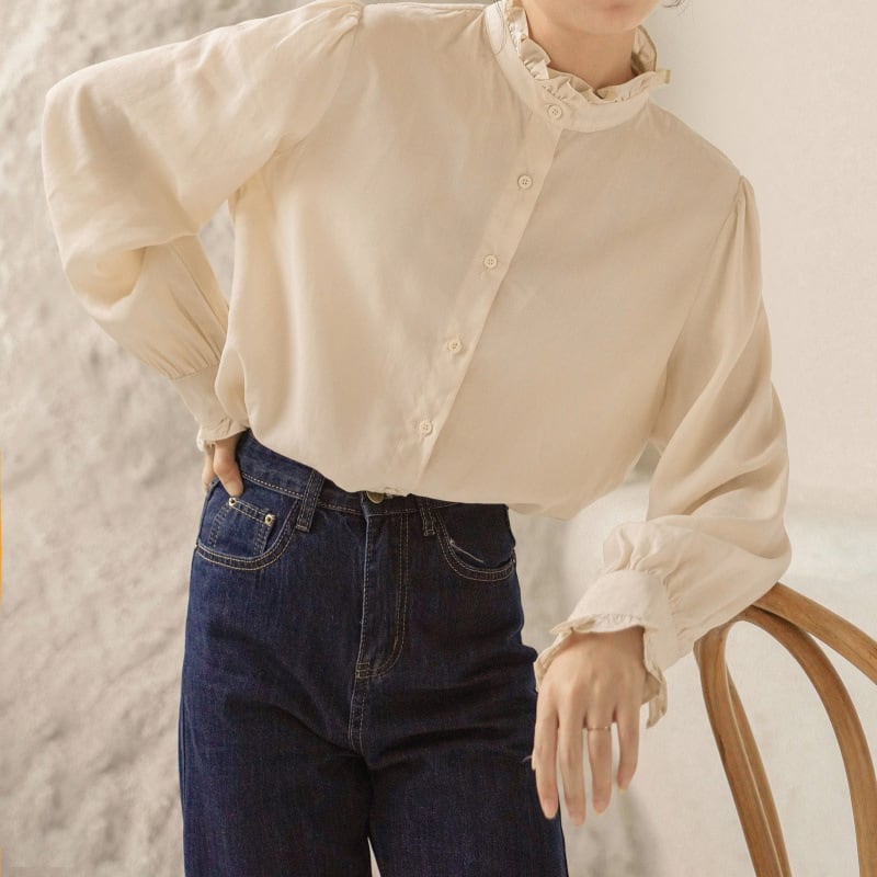 大人可愛いスタンドカラーのシンプルなブラウス。