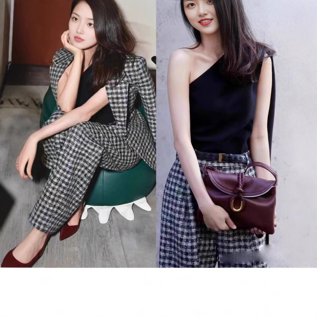 大人エレガントなギンガムチェックのジャケット+テーパードパンツのセットアップスーツ。