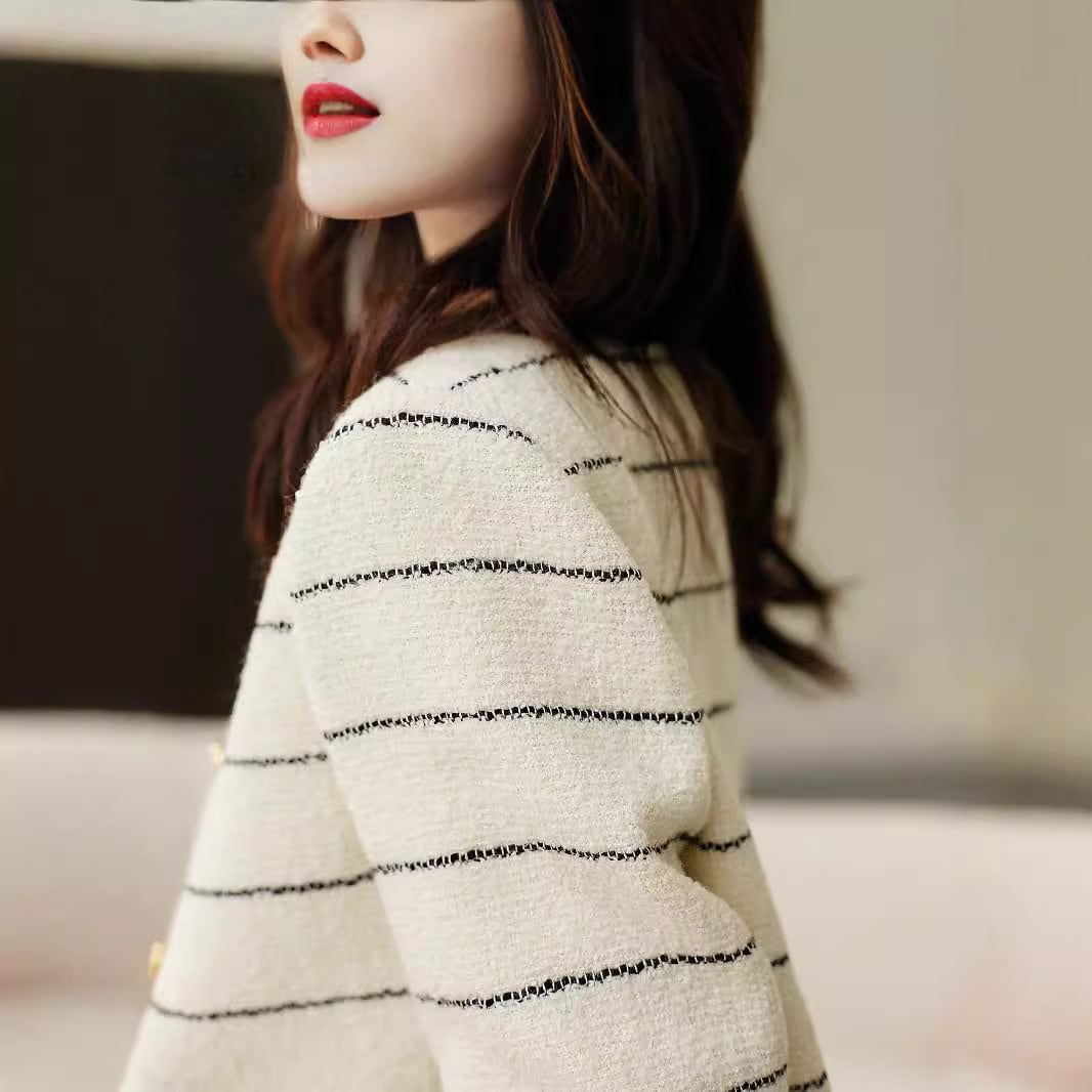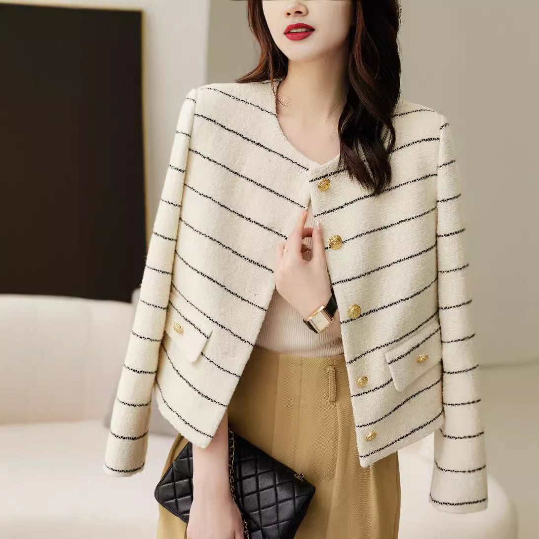 大人可愛いボーダー柄のノーカラージャケット。