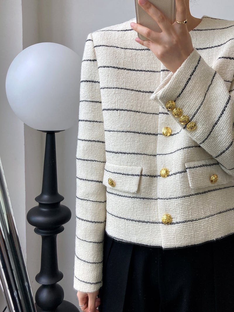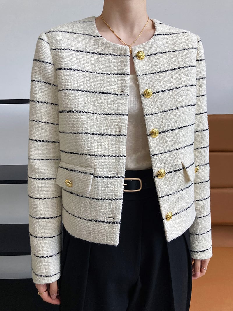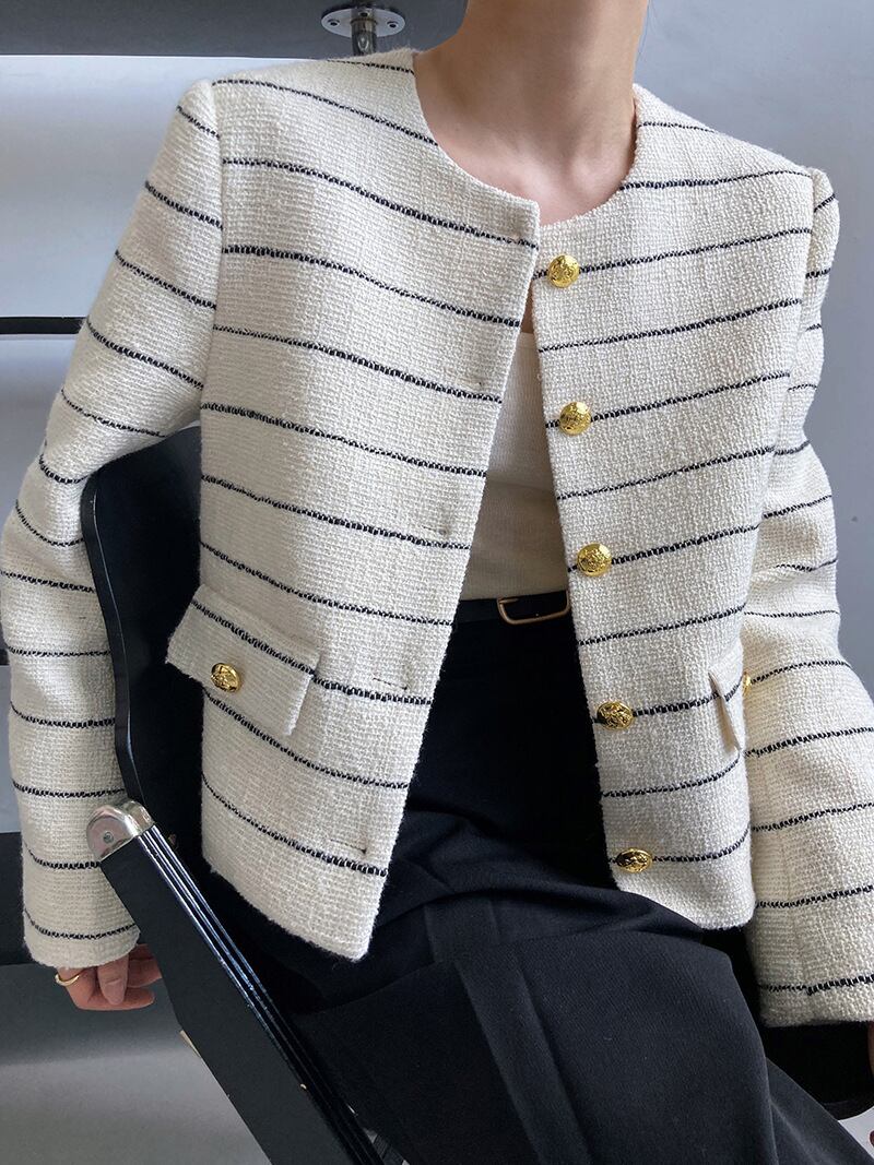 大人可愛いボーダー柄のノーカラージャケット。