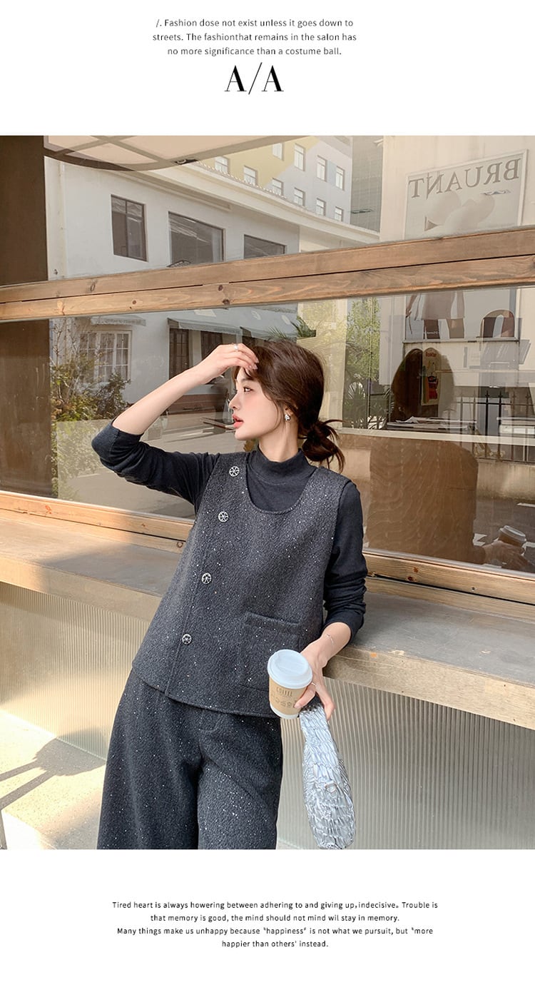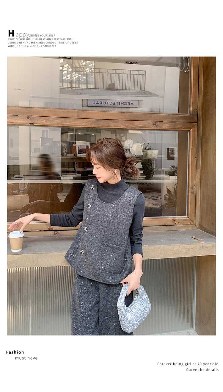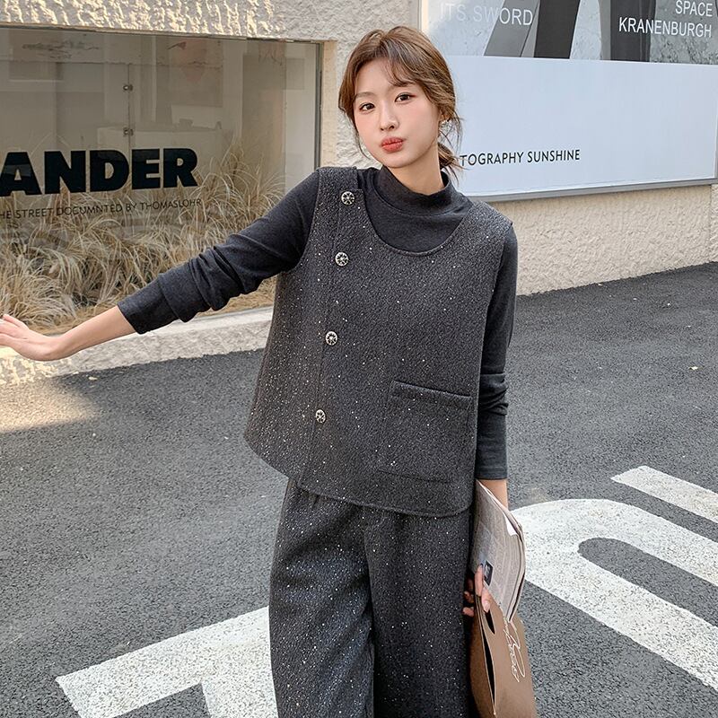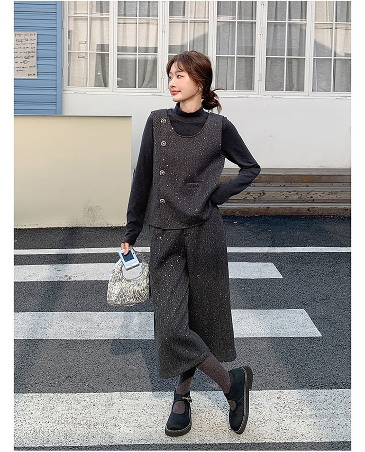 大人可愛いジレ+カットソー+パンツのセットアップ。