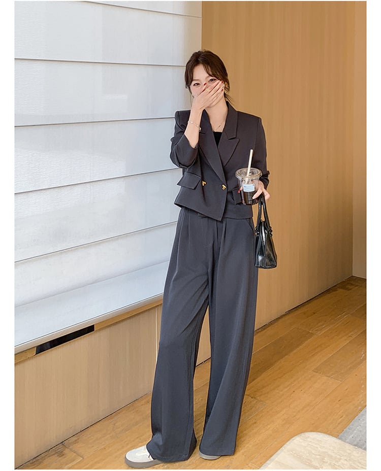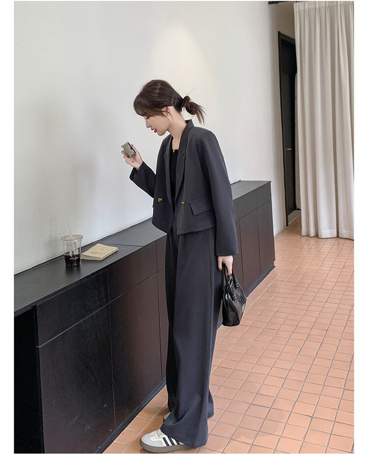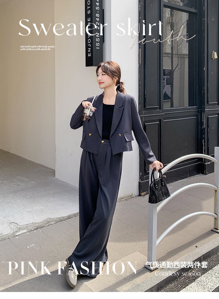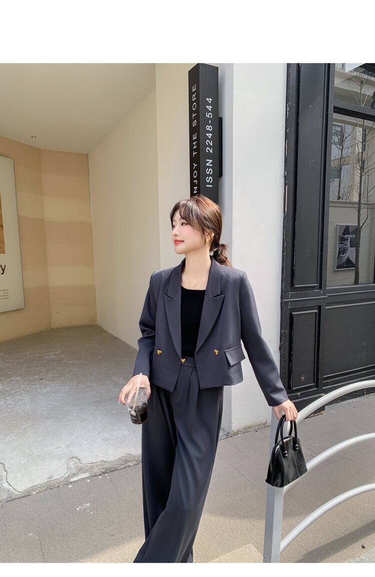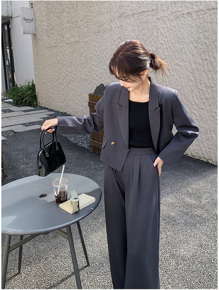 大人可愛いクロップド丈ジャケット+パンツのセットアップスーツ。