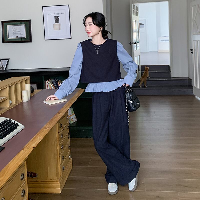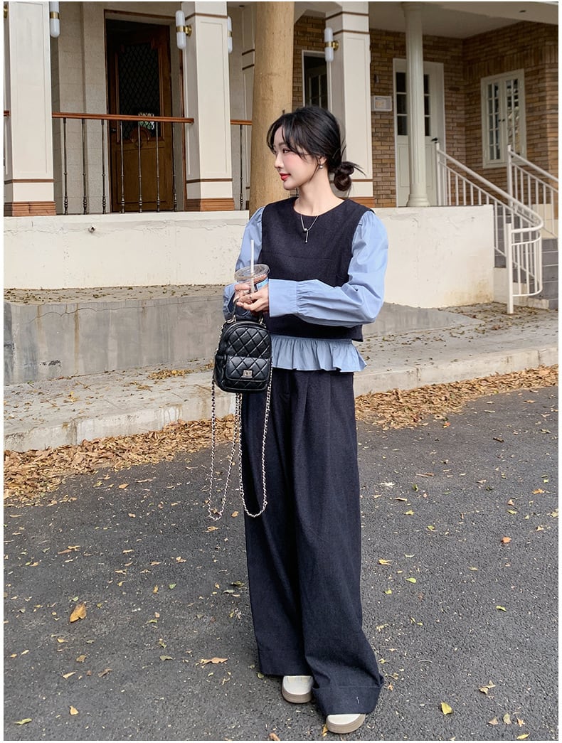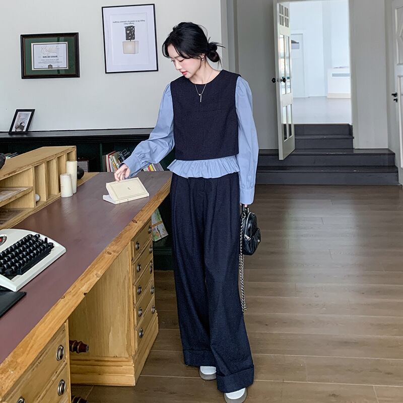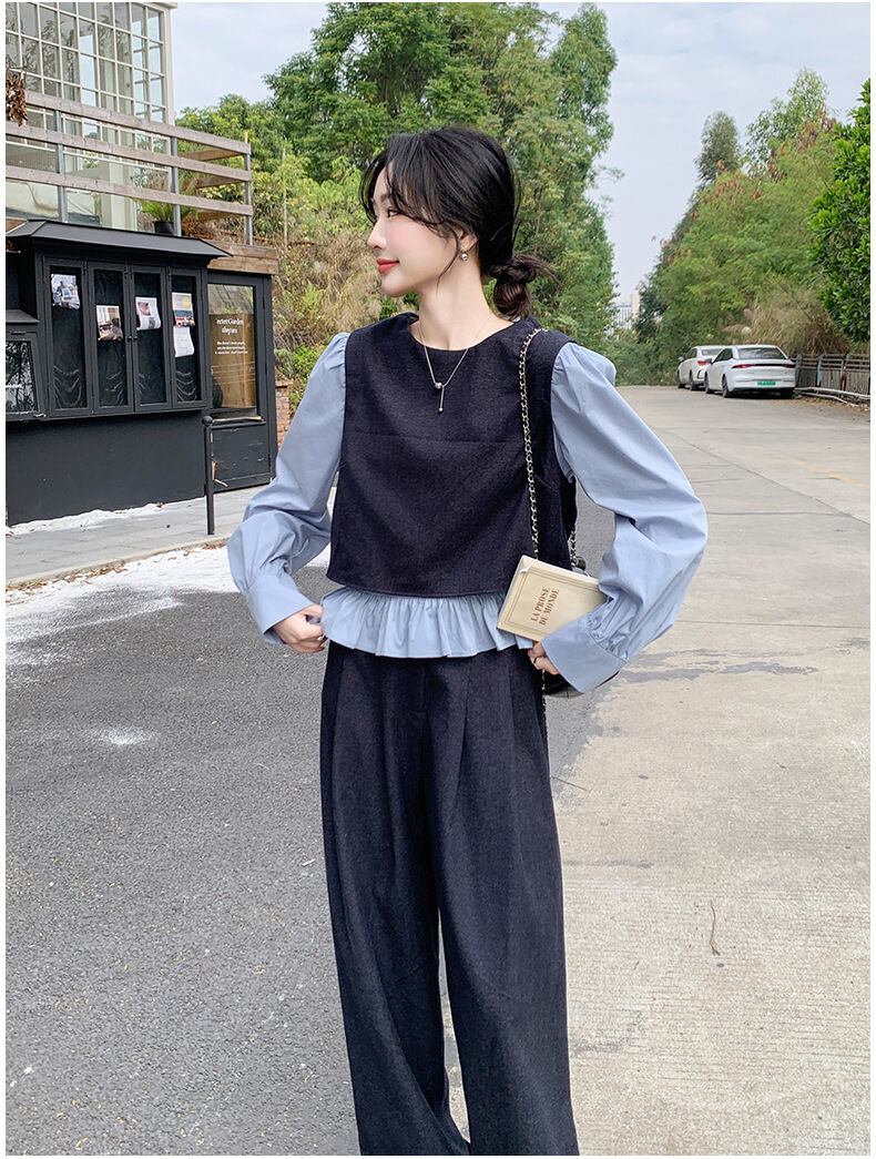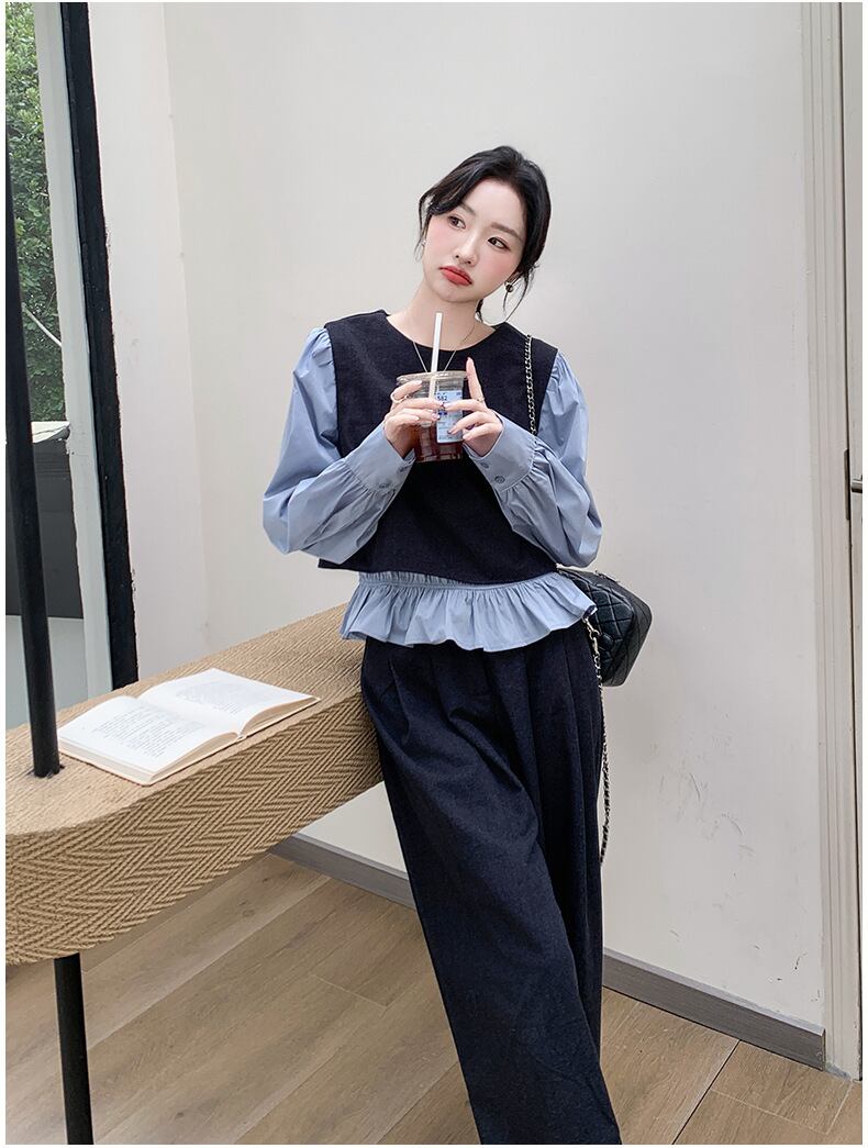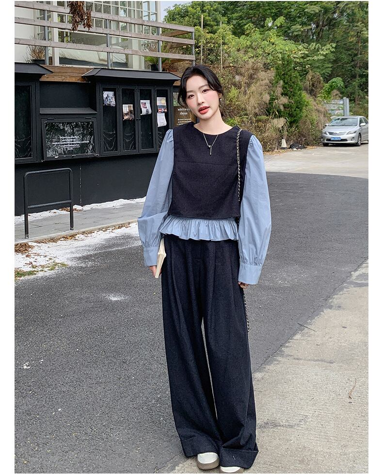 大人可愛い異素材ミックストップス+ワイドパンツのセットアップ。