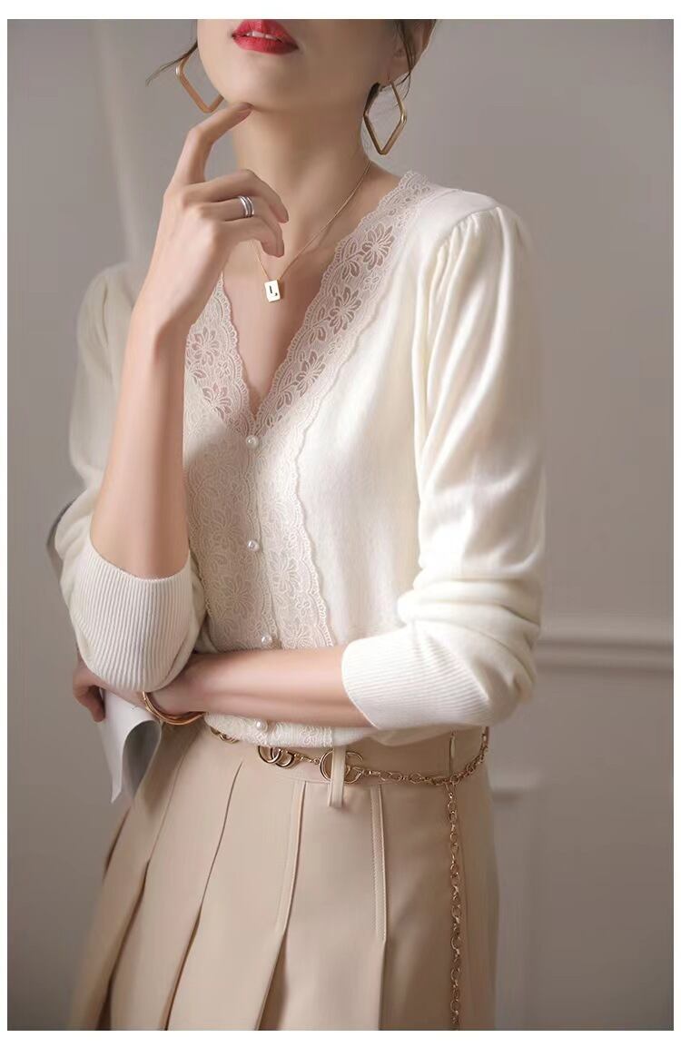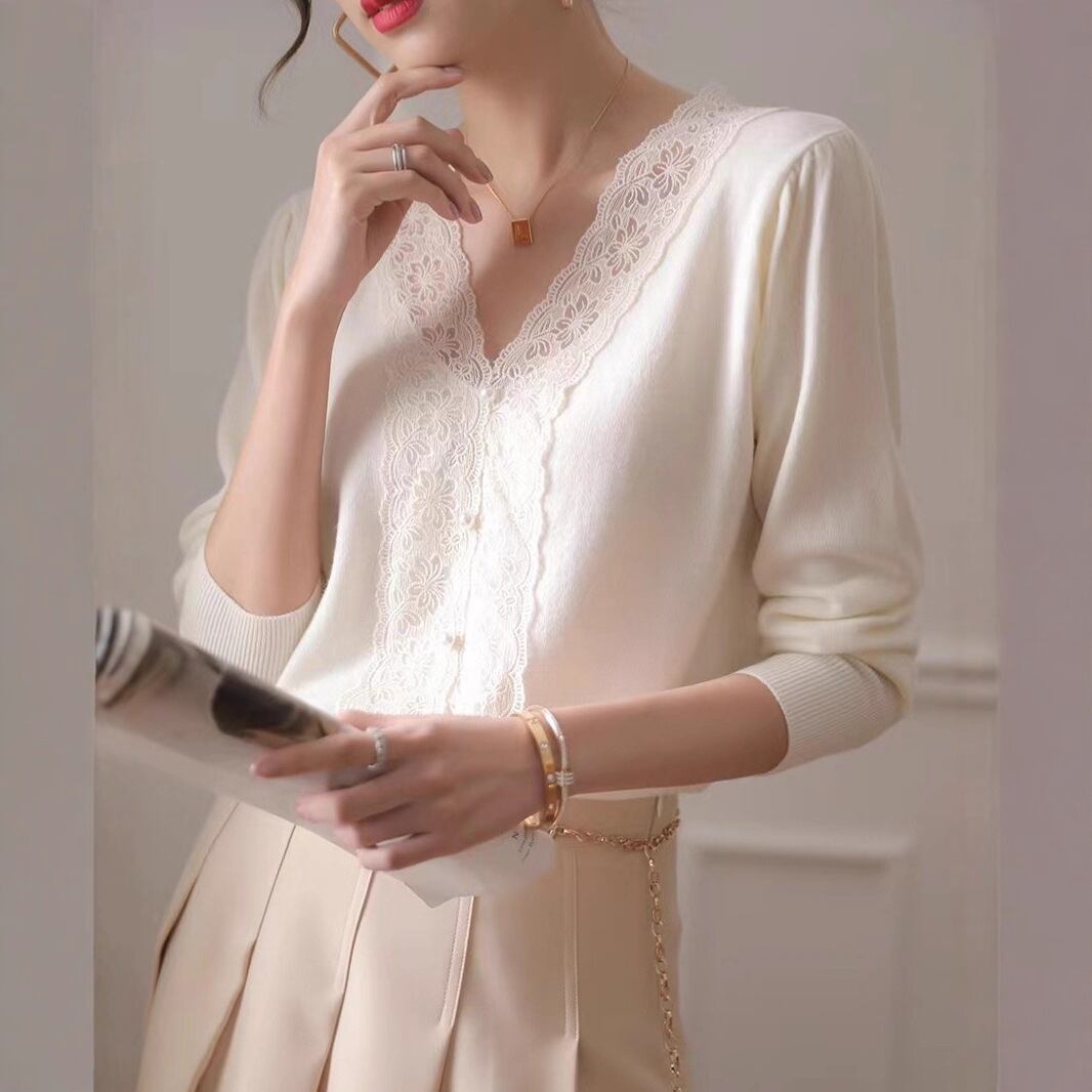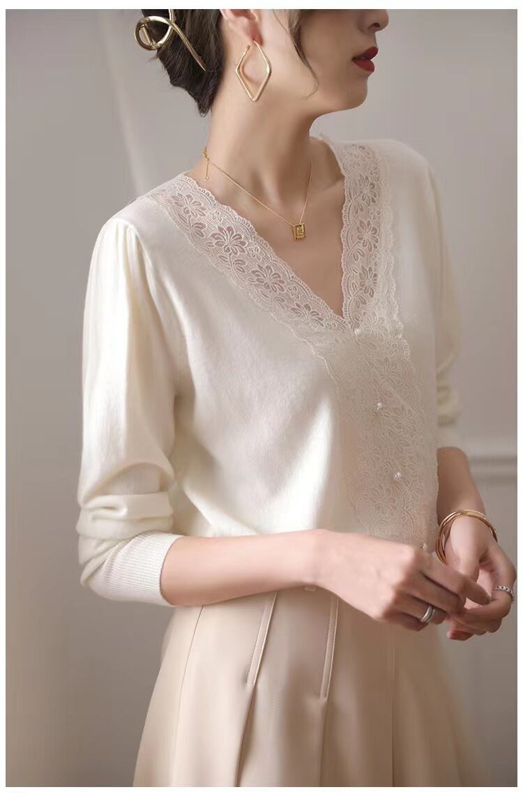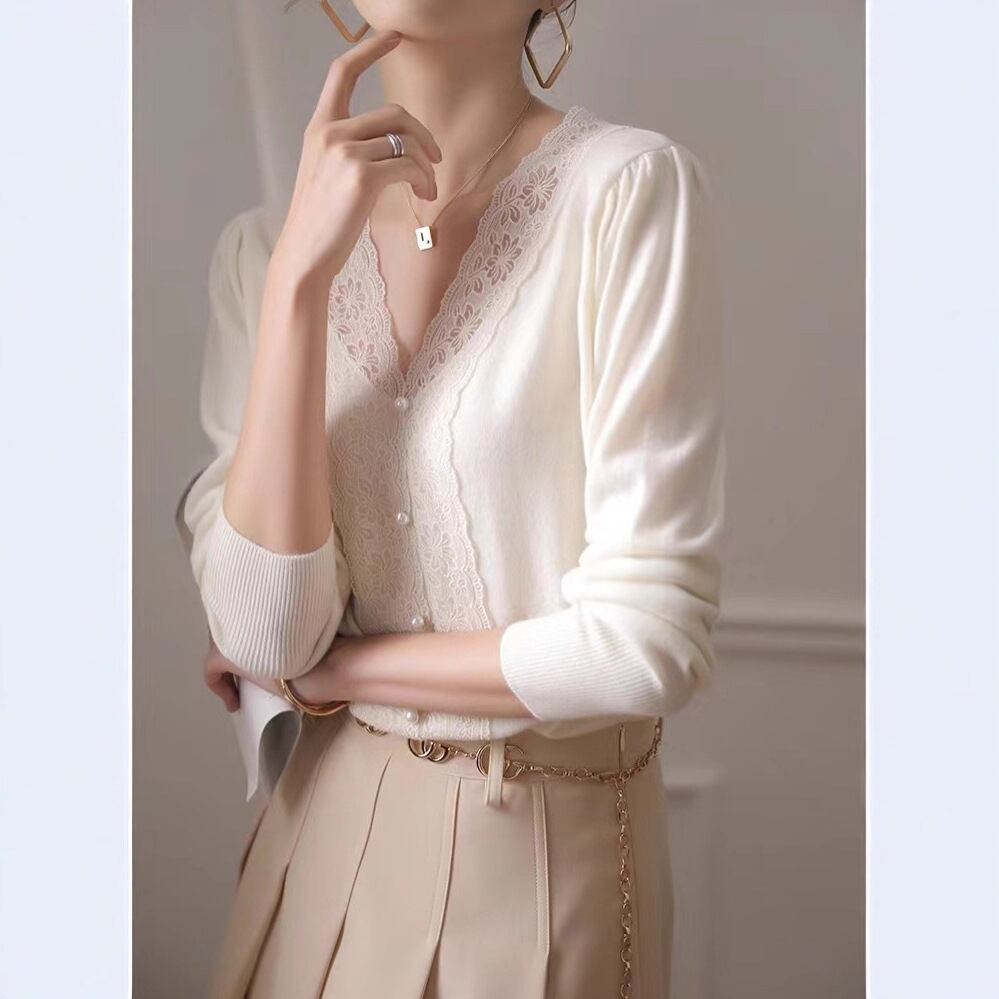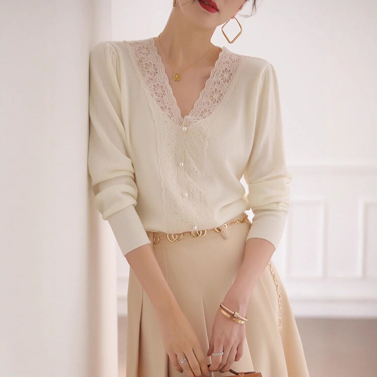 胸のレース使いが目を惹く薄手のニットセーター。