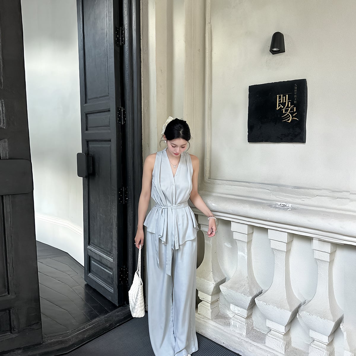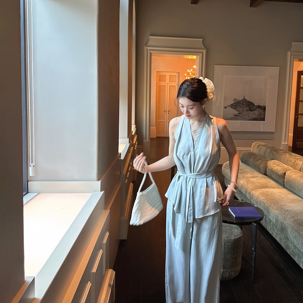 大人エレガントなホルターネックセットアップタイプのパンツドレス。