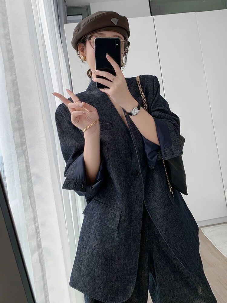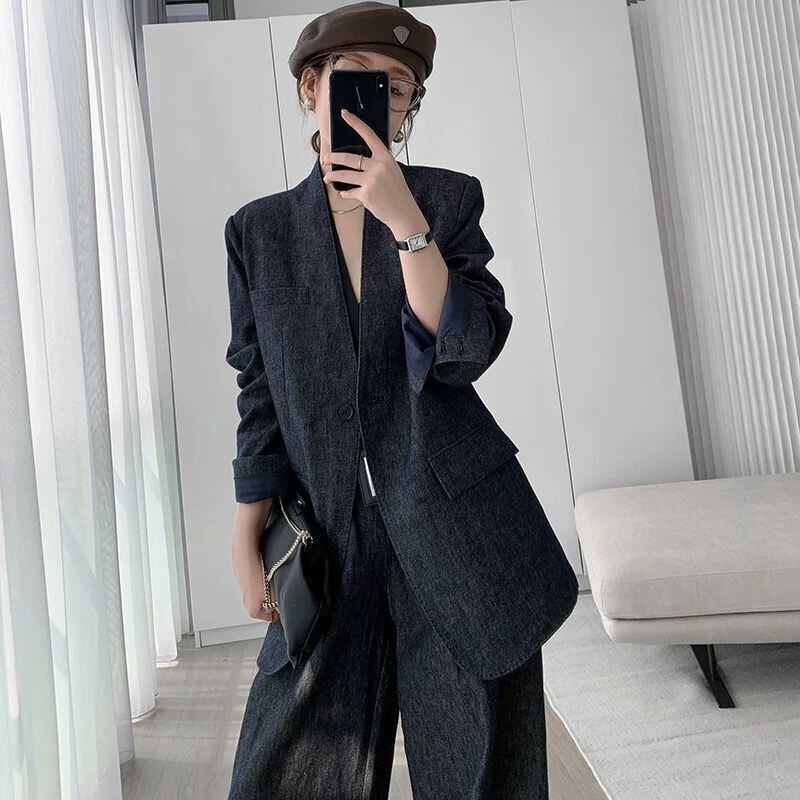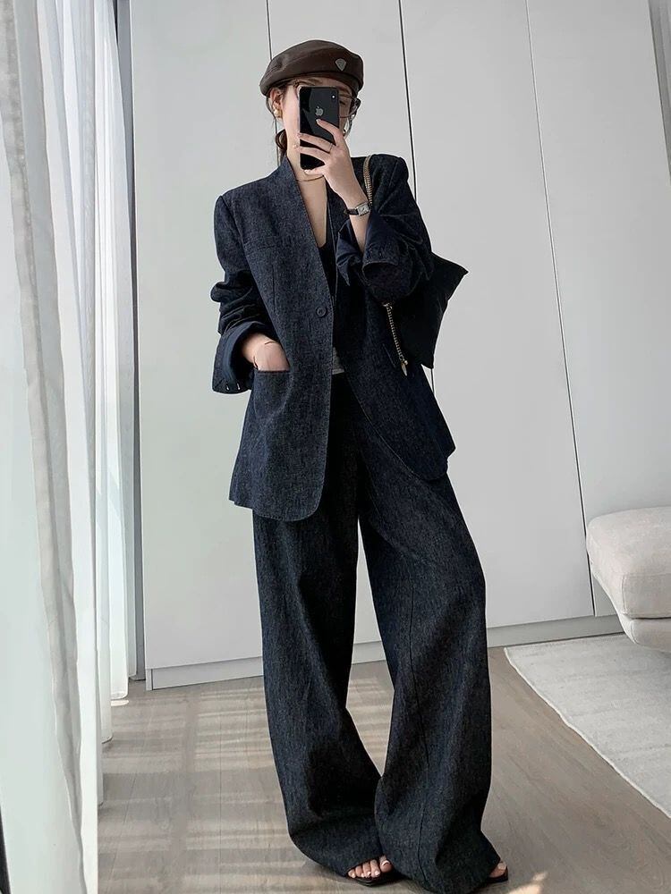 大人エレガントなノーカラージャケット+ワイドパンツのセットアップスーツ。