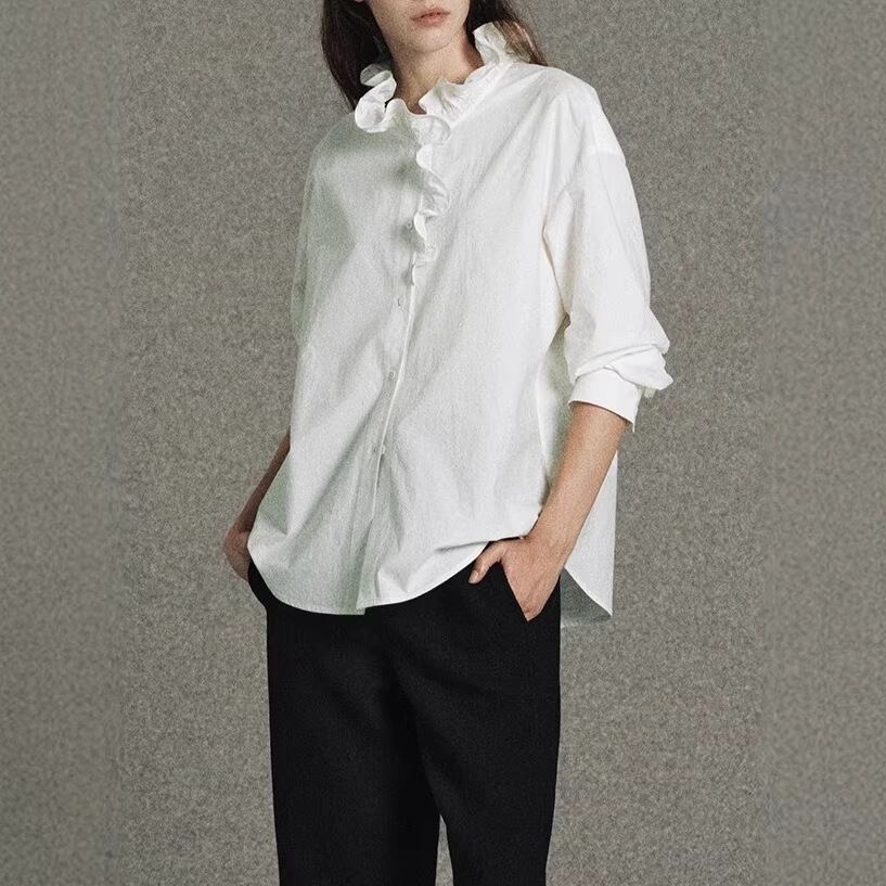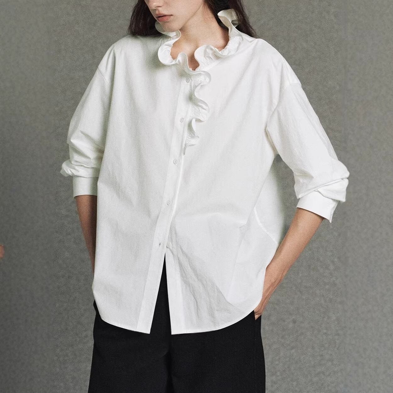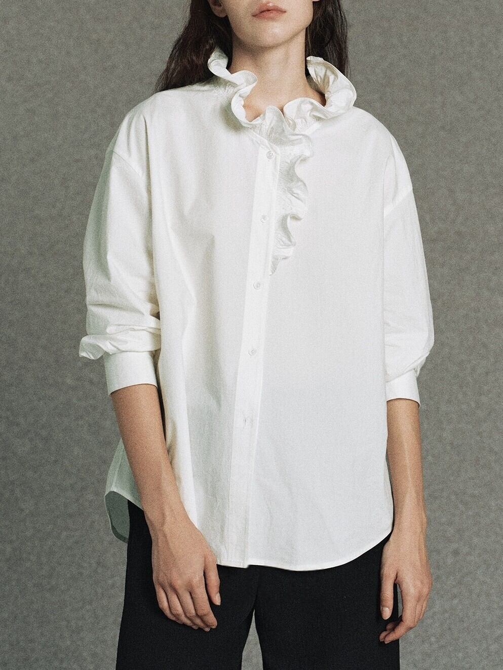 襟のフリルが目を惹くウェーブフリルシャツ。