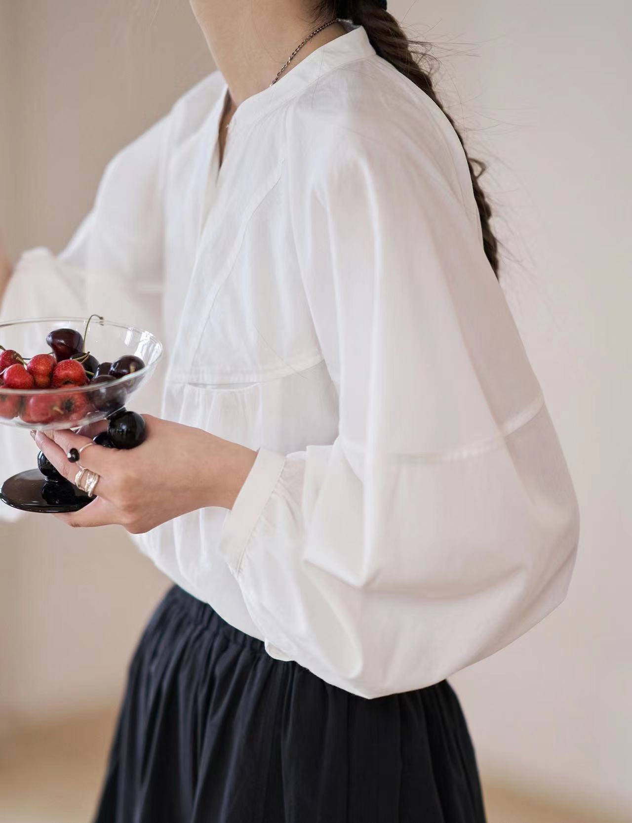 ボリューミーなお袖が目を惹くバンドカラーブラウス。