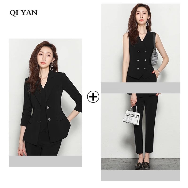 大人エレガントなジャケット+ジレ+テーパードパンツのセットアップスーツ。