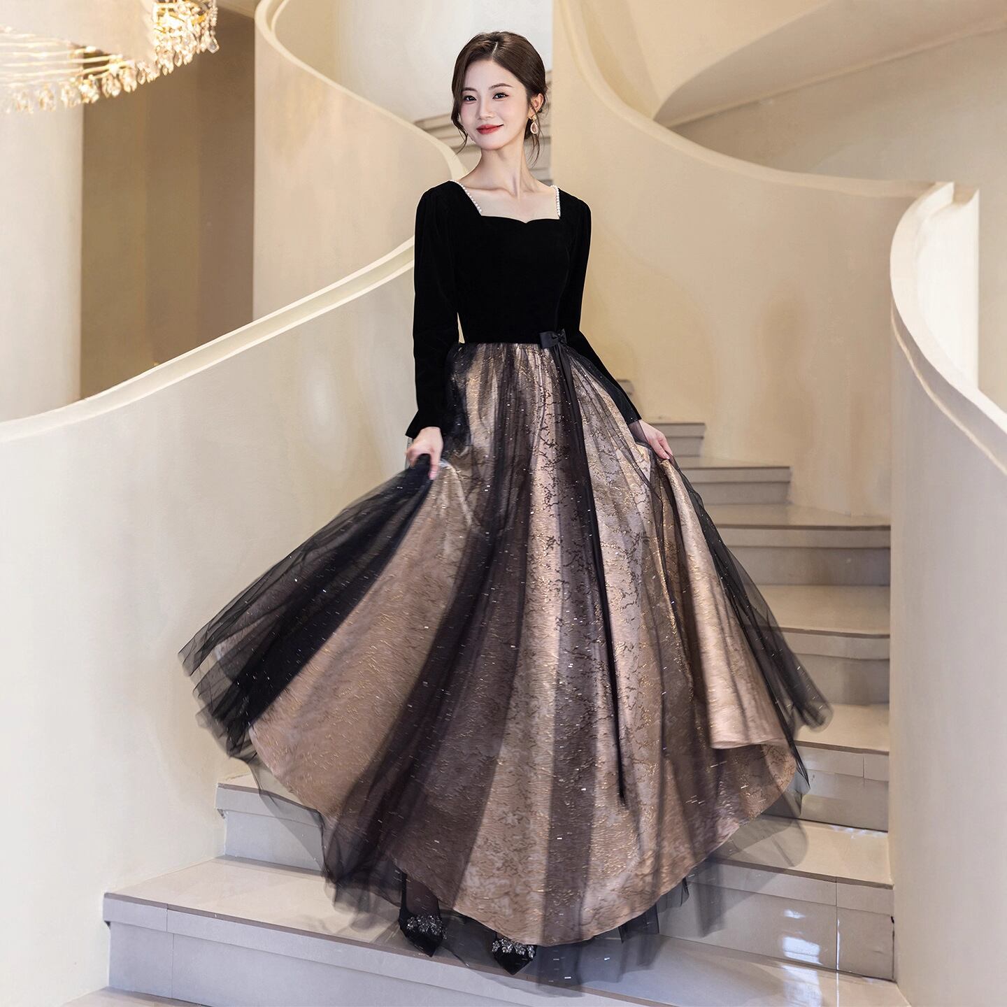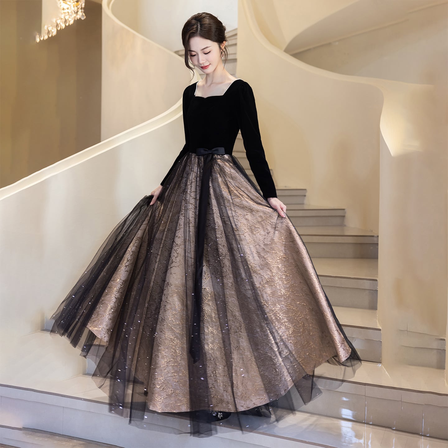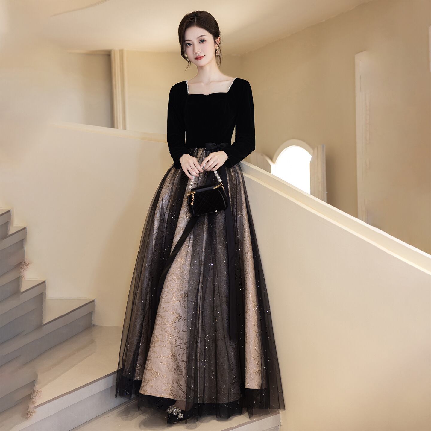 スクエアネックでデコルテラインを美しく華奢に魅せお袖はタイトで二の腕をカバー。