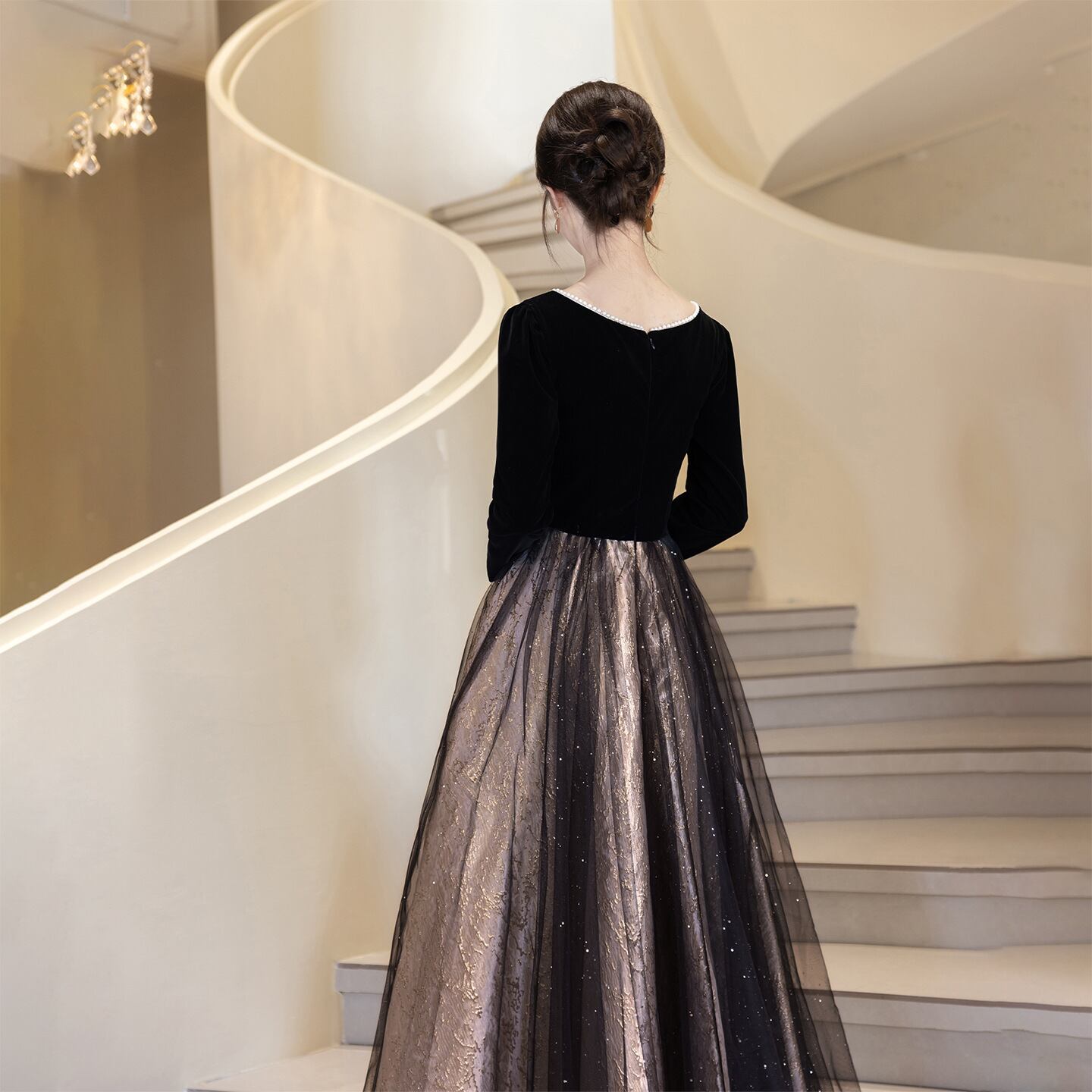 グラデーションカラーのチュールがエレガントなパーティードレス。