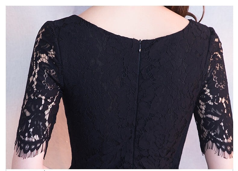 総レースの透け感ある五分袖が女性らしさを引き立てる。