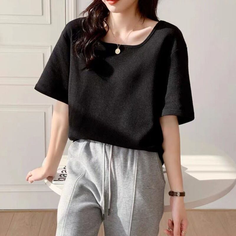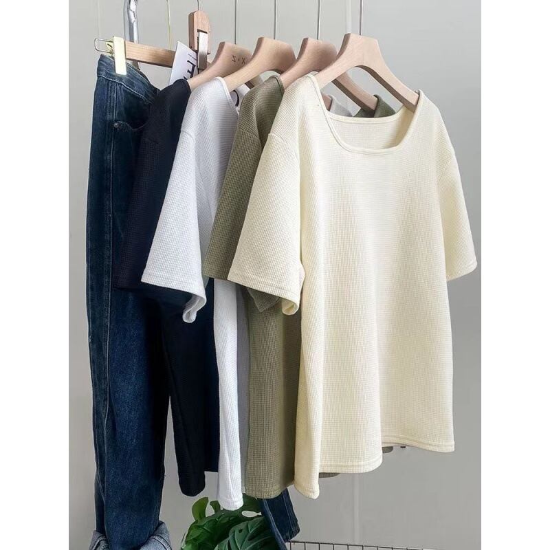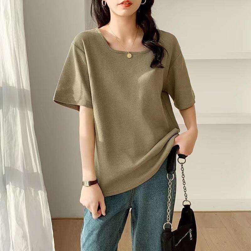 大人カジュアルなスクエアネックのワッフル素材ニットセーター。
