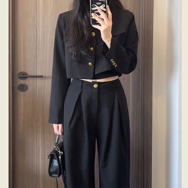クロップド丈のジャケットでハイウエストパンツと相性抜群。