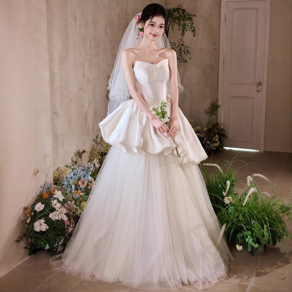 大人可愛いペプラムデザインのウェディングドレス。