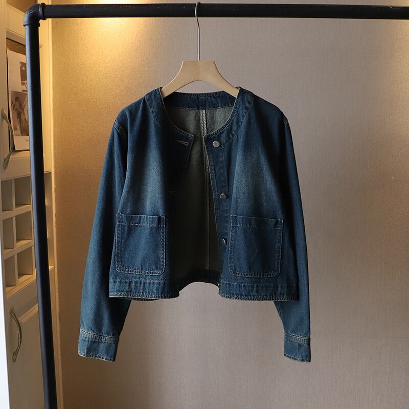 大人可愛いノーカラーのデニムジャケット。