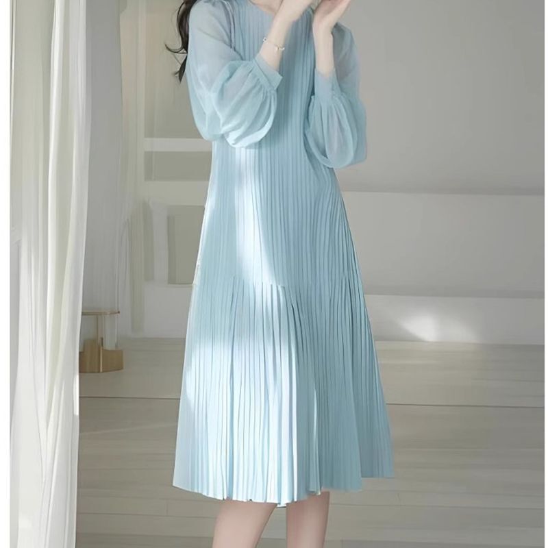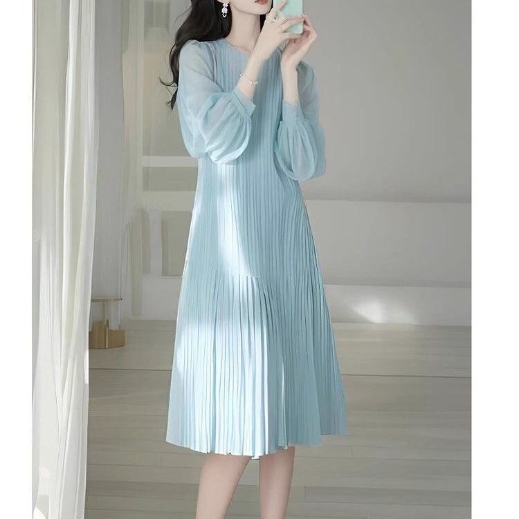 真っ青なアイシーブルーのプリーツワンピース。