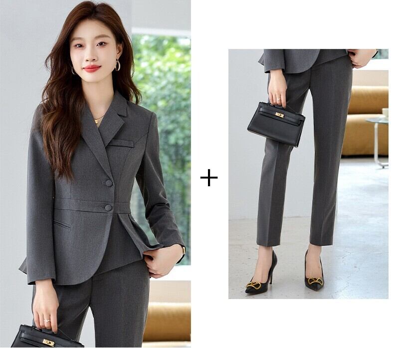 大人エレガントなジャケット+テーパードパンツのセットアップスーツ。