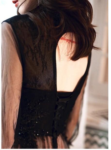 お袖の透け感とバストのスパンコールが大人エレガントなパーティードレス。