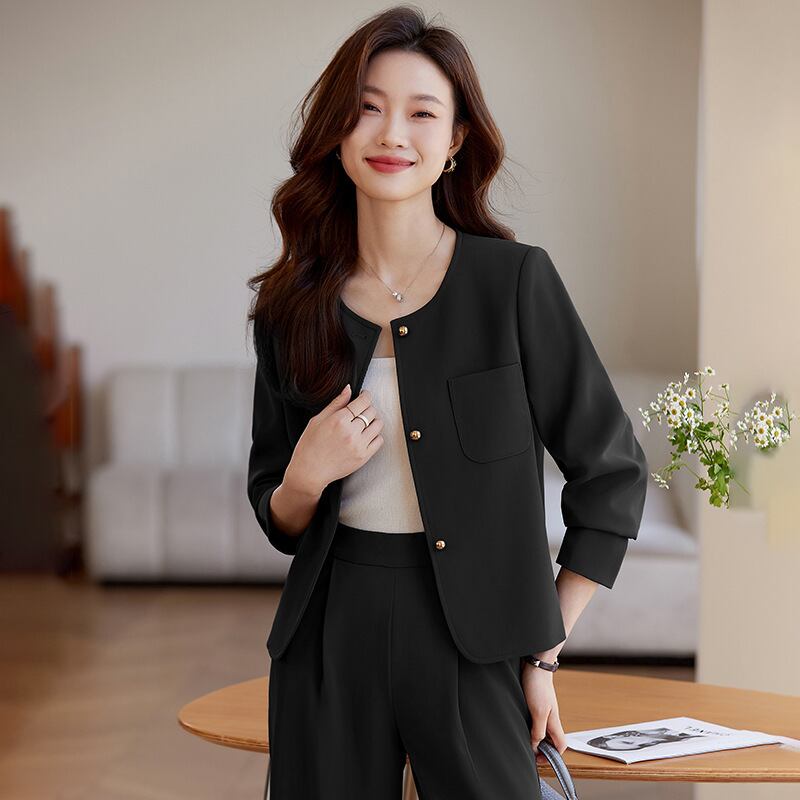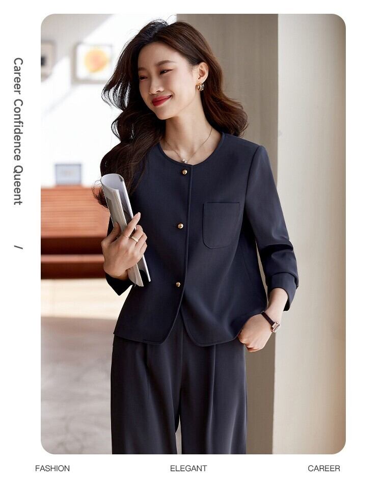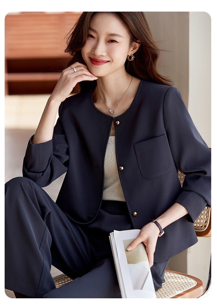 大人可愛いノーカラージャケット+ワイドパンツのセットアップ。