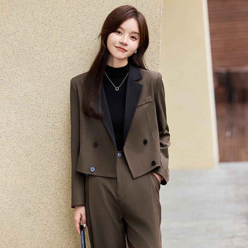 バイカラーでおしゃれ度高くコンパクトジャケットで腰高美脚効果。