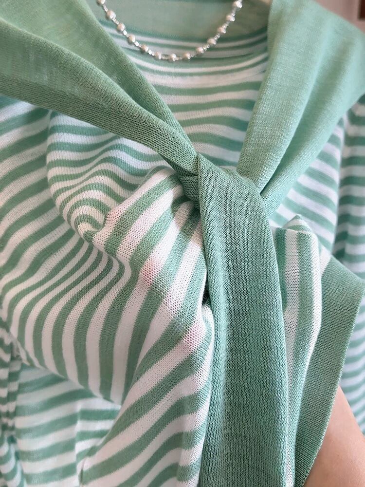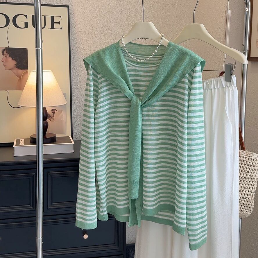 大人可愛いカーディガン付きのストライプ柄ニットセーター。