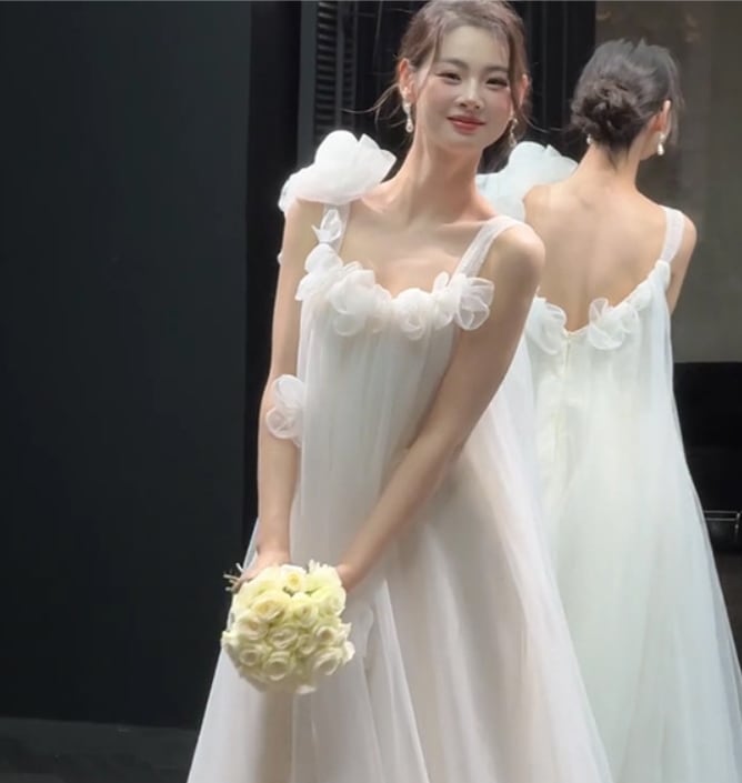 バストと肩口の立体お花刺繍が目を惹くウェディングドレス。