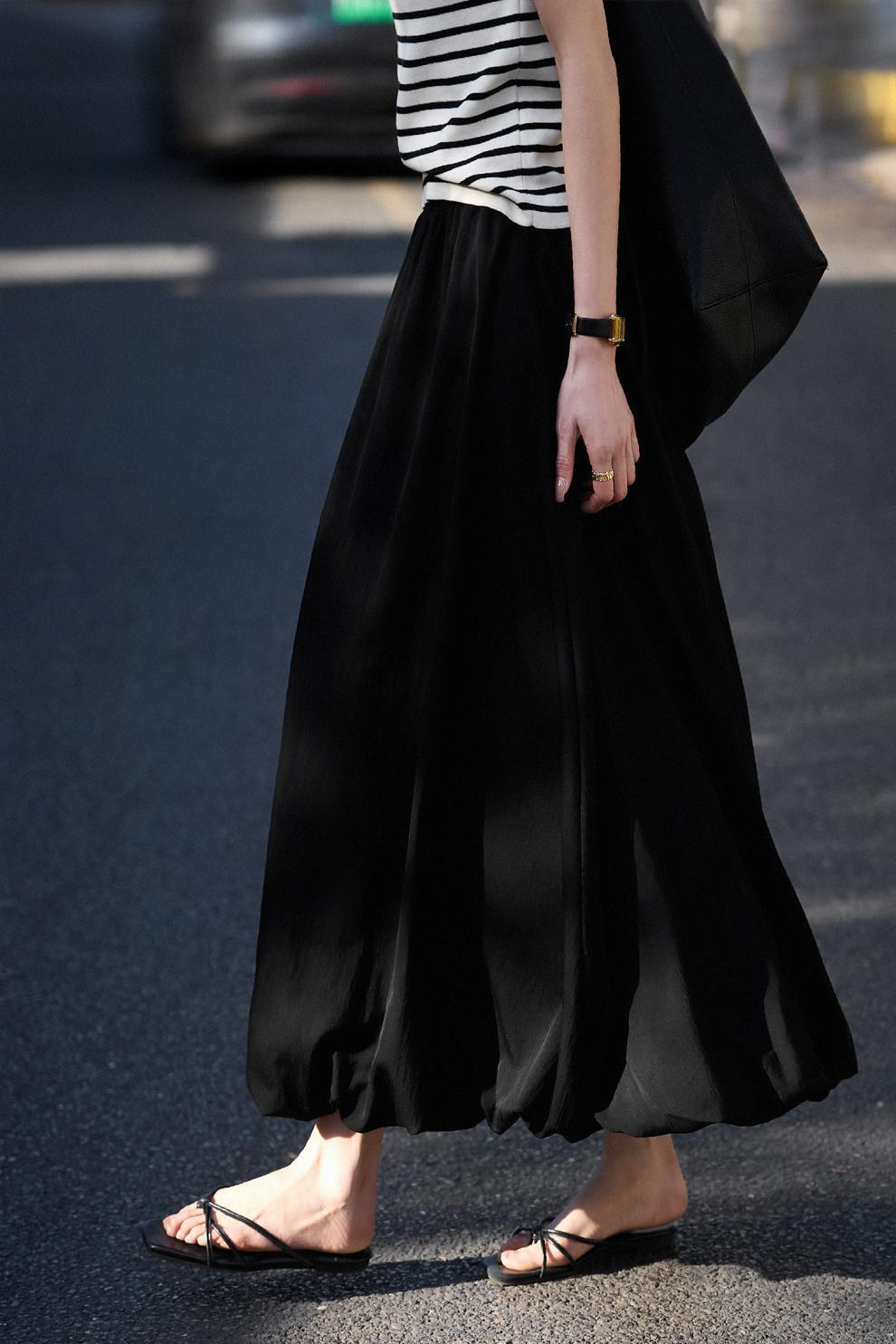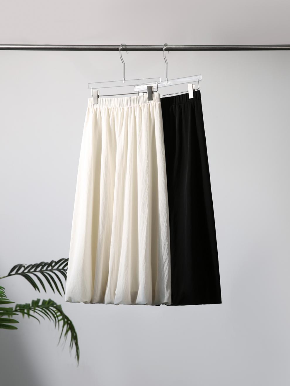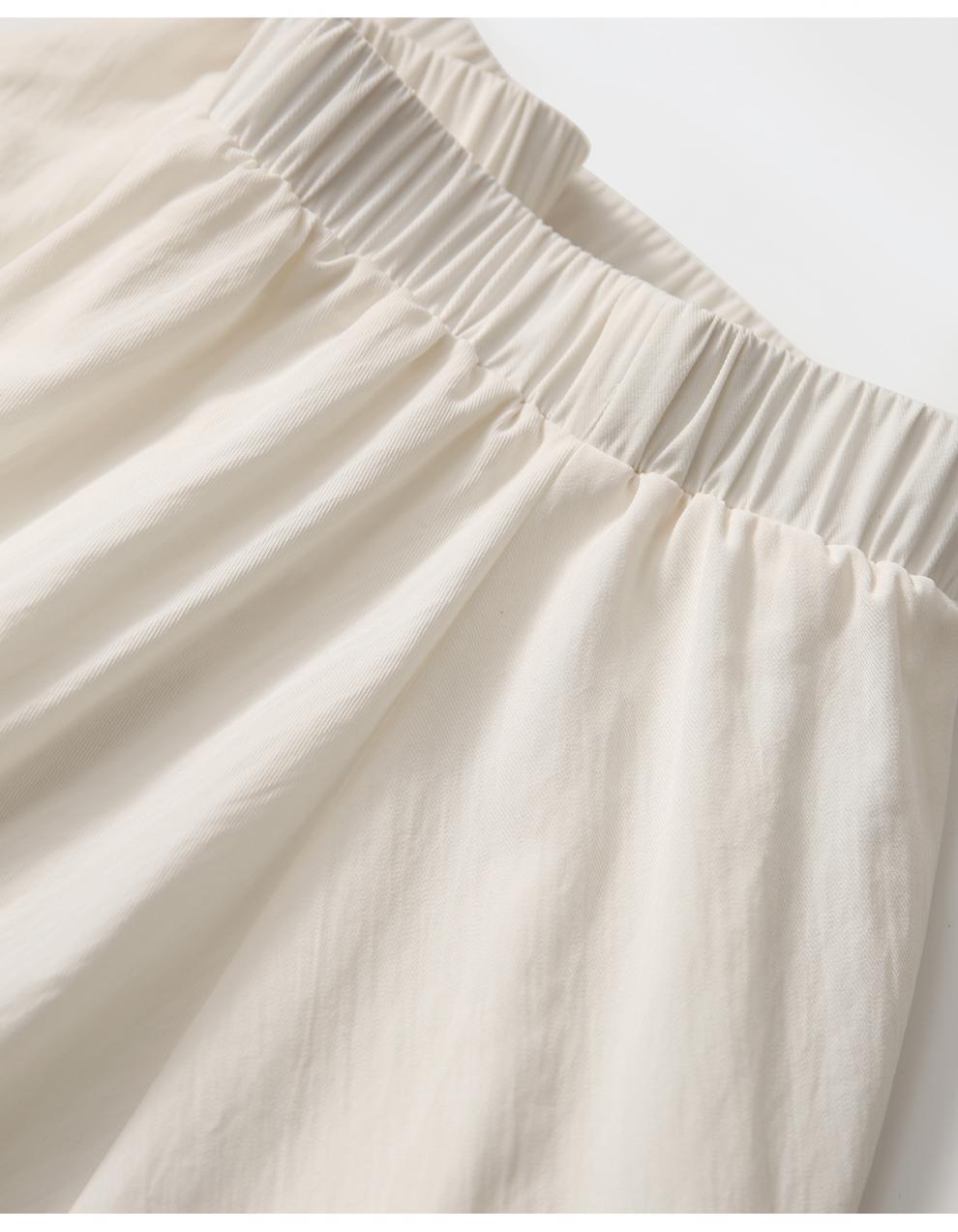 ウエストゴムで腰まわりはフィットしすとんと落ち感のあるシルエットでボリュームもでにくい。