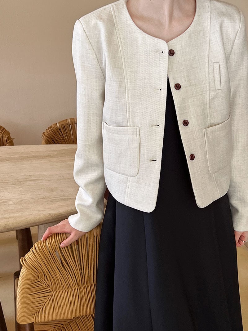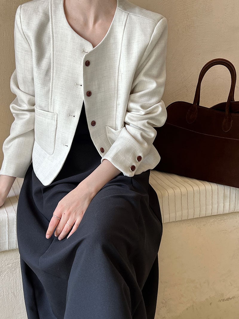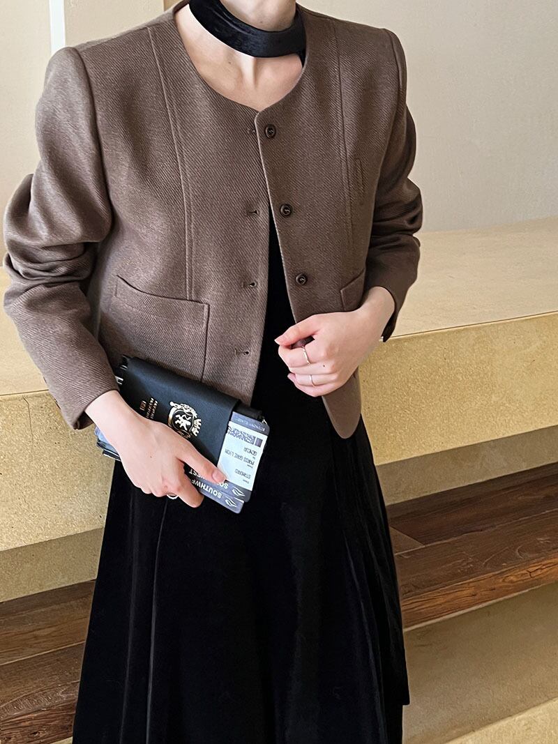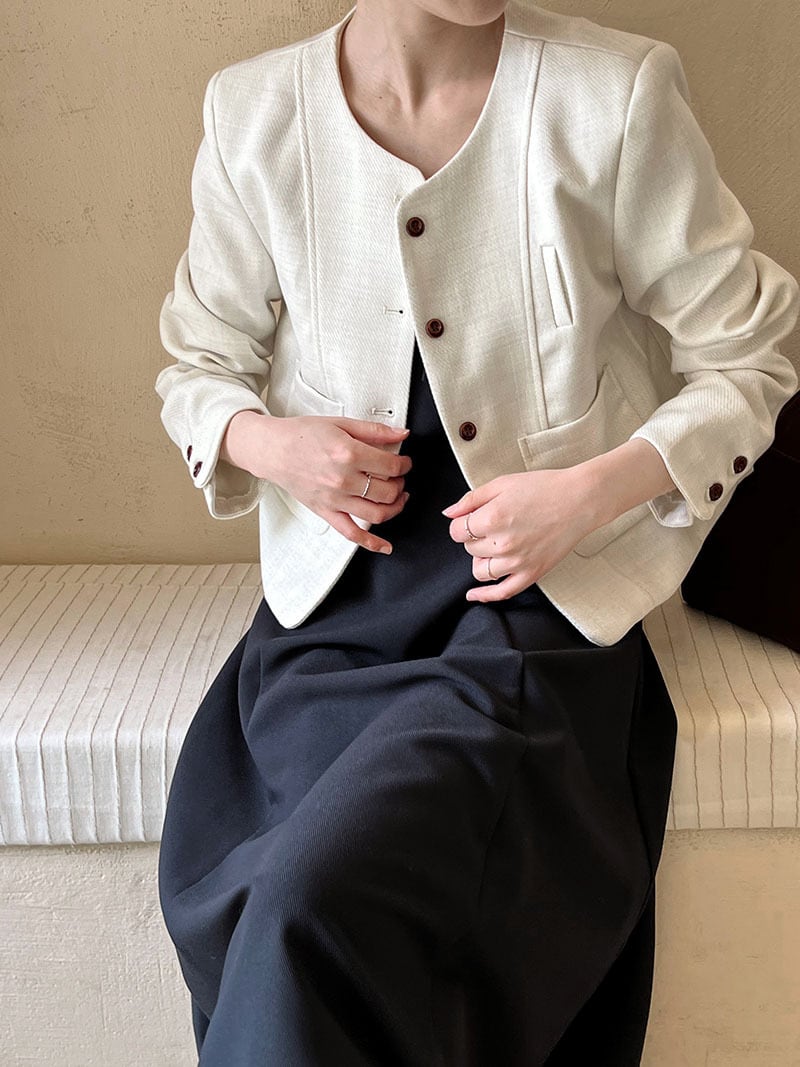 大人エレガントでシックなカラーリングのノーカラージャケット。