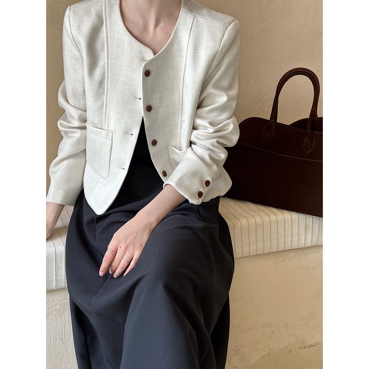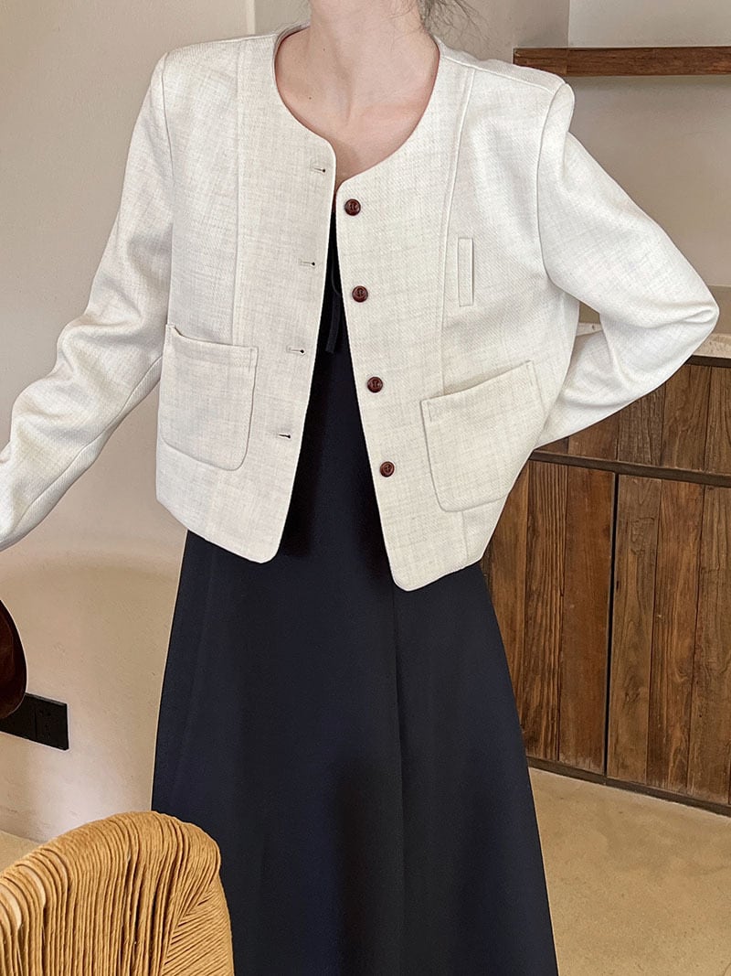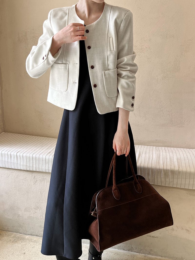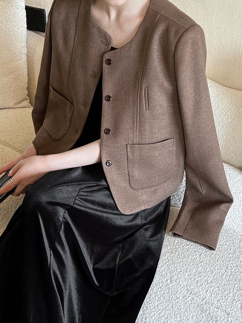 大人エレガントでシックなカラーリングのノーカラージャケット。