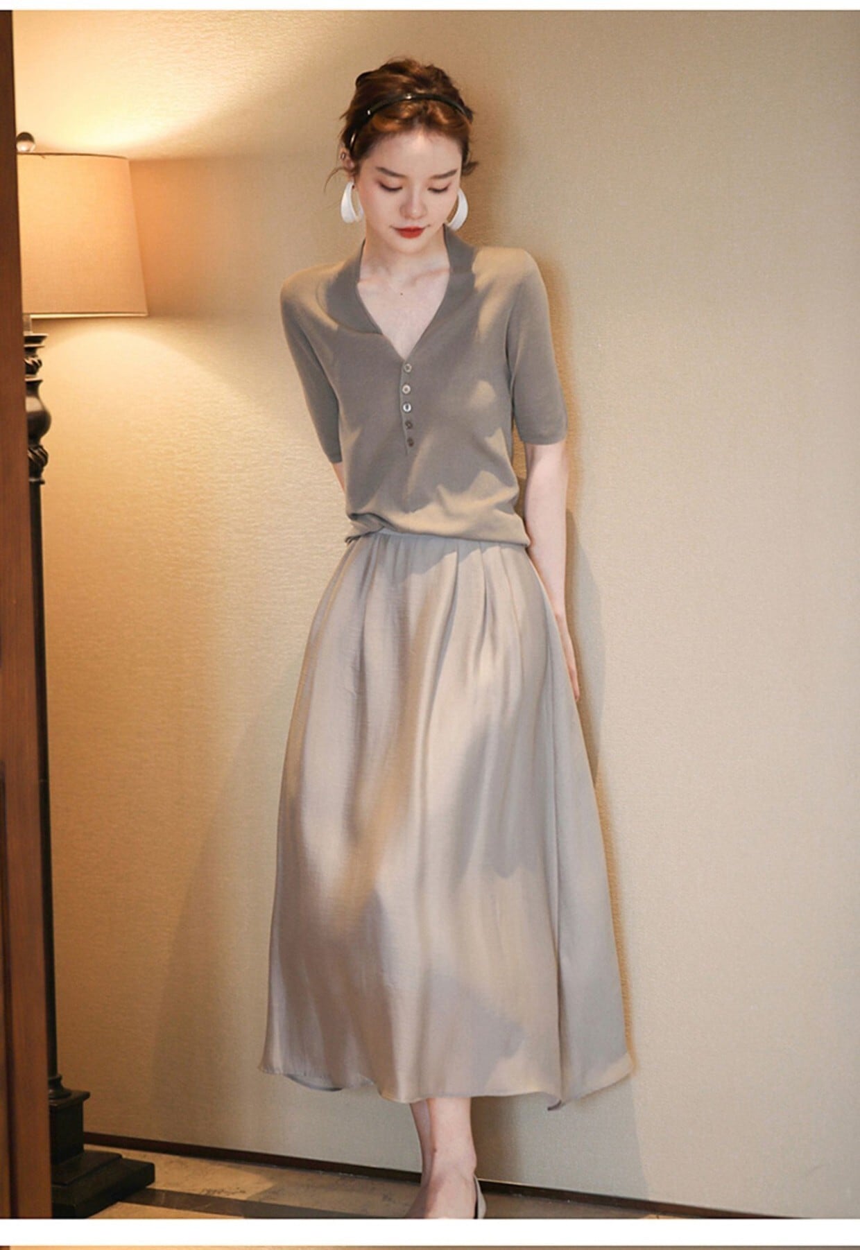 大人可愛いライトブルーのシャツトップス+フレアスカート。