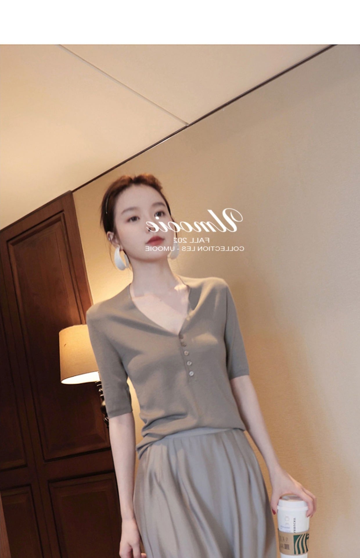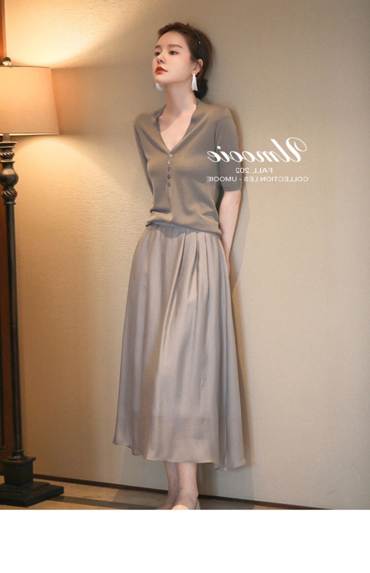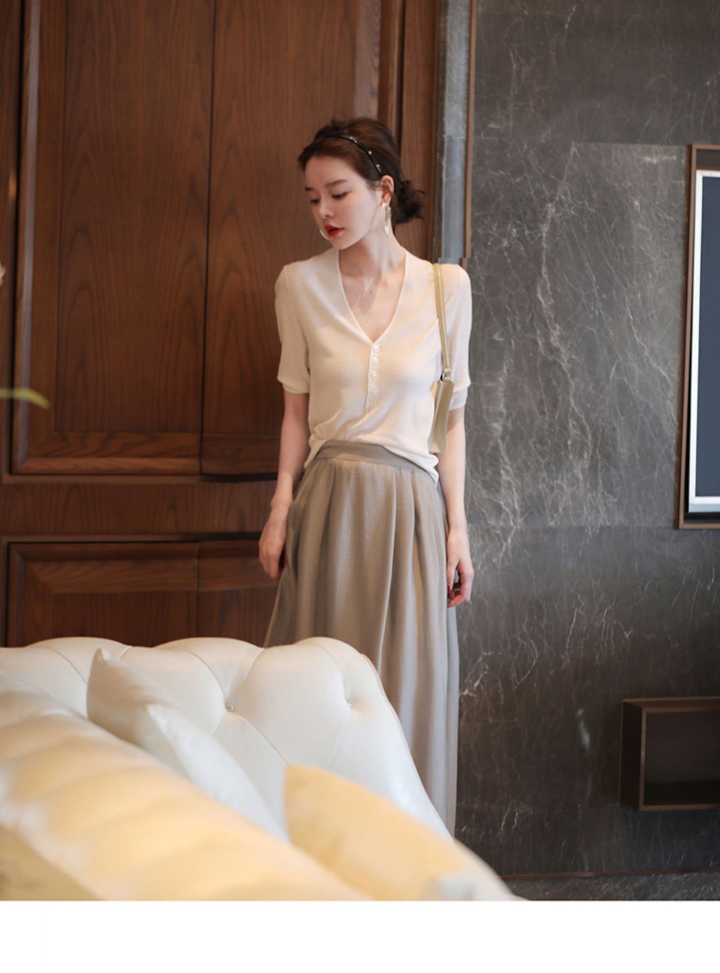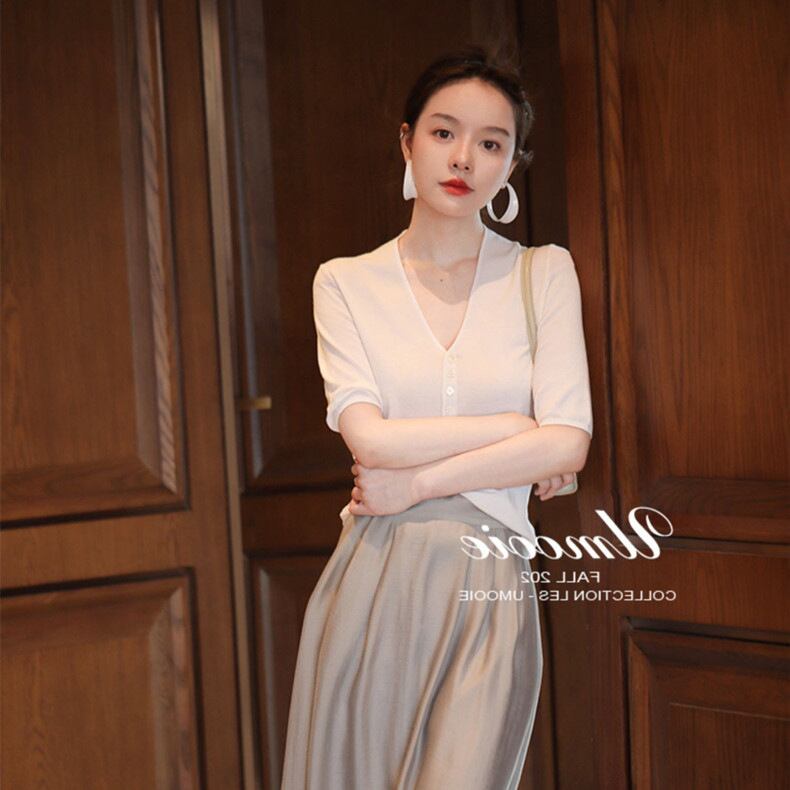 五分袖で気になる二の腕カバーと深いvネックでデコルテのきれい見せ。