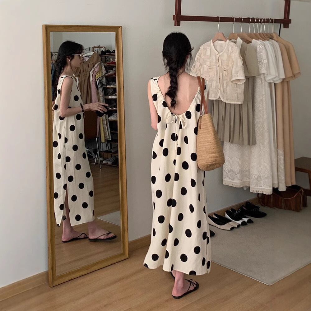 オープンバックな後ろ姿がちょっぴりセクシーなドット柄ワンピース。