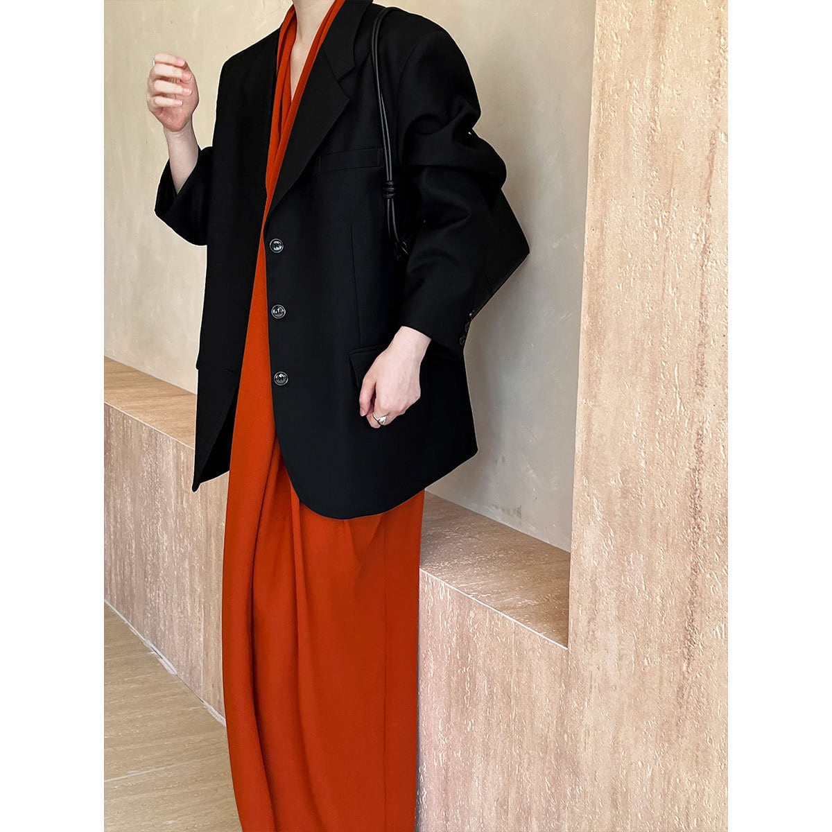 シングルブレストでウエストラインをすっきりと華奢に。