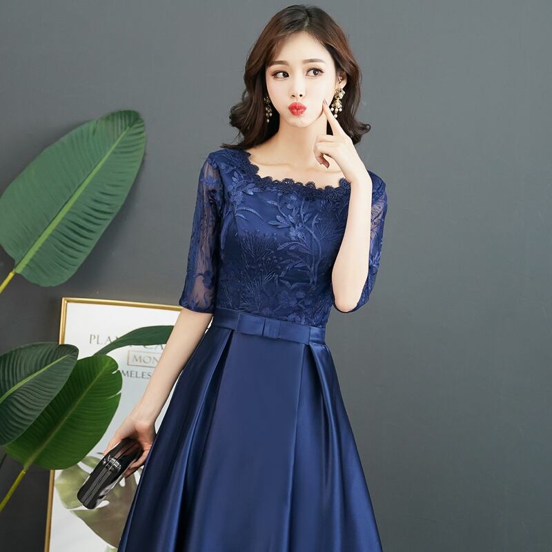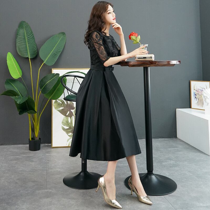 バストのレース感がエレガントなミモレ丈のパーティードレス。