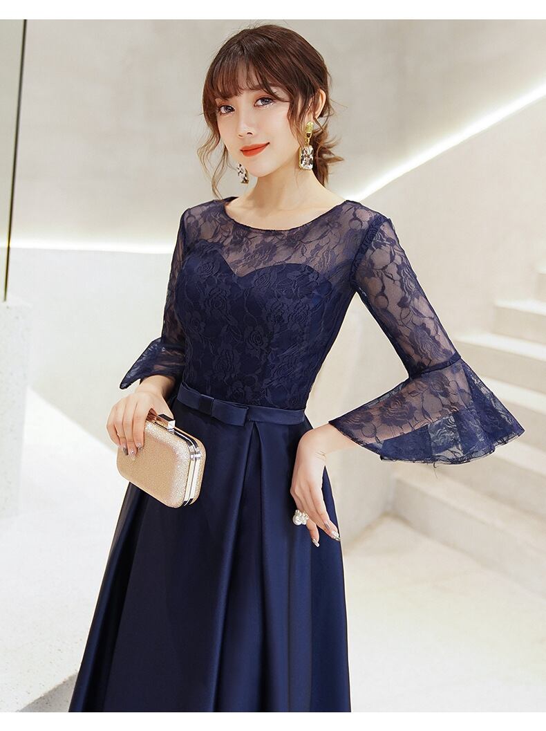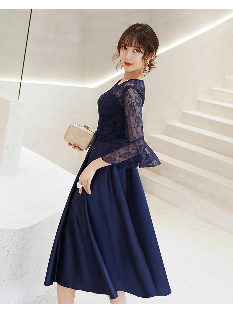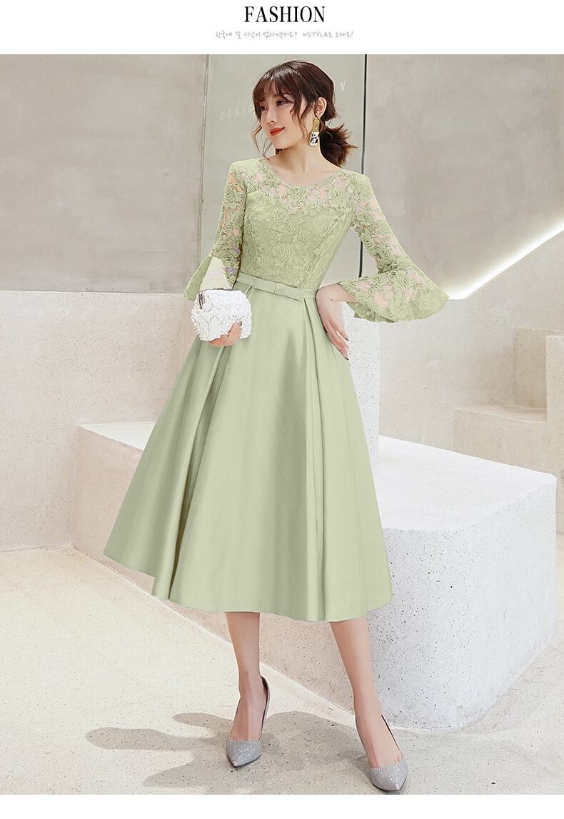 バストのレース感がエレガントなミモレ丈のパーティードレス。