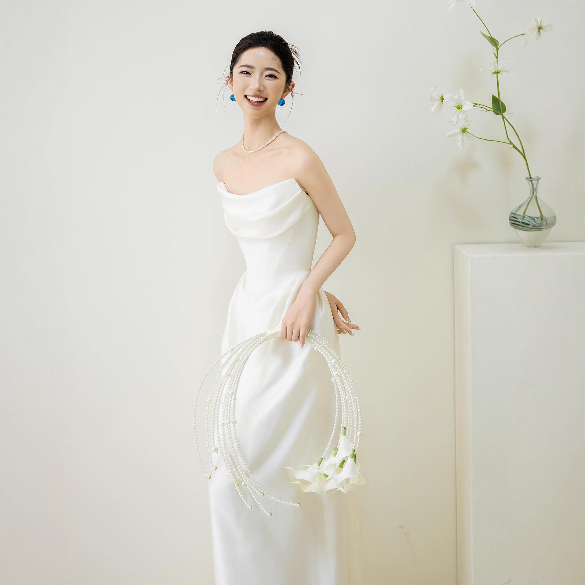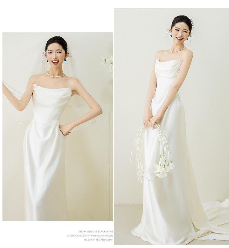 長めのトレーンが上品で目を惹く一着。