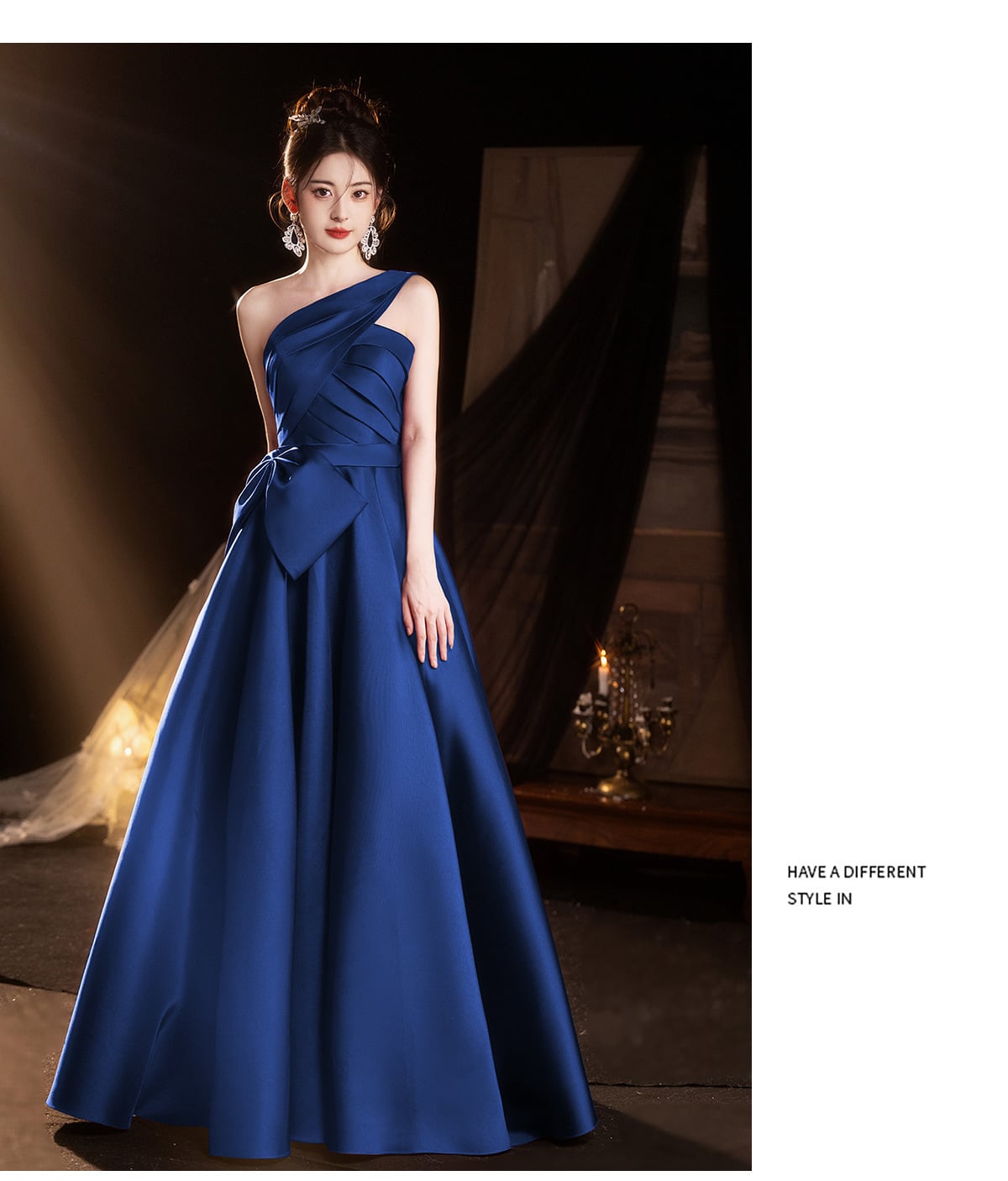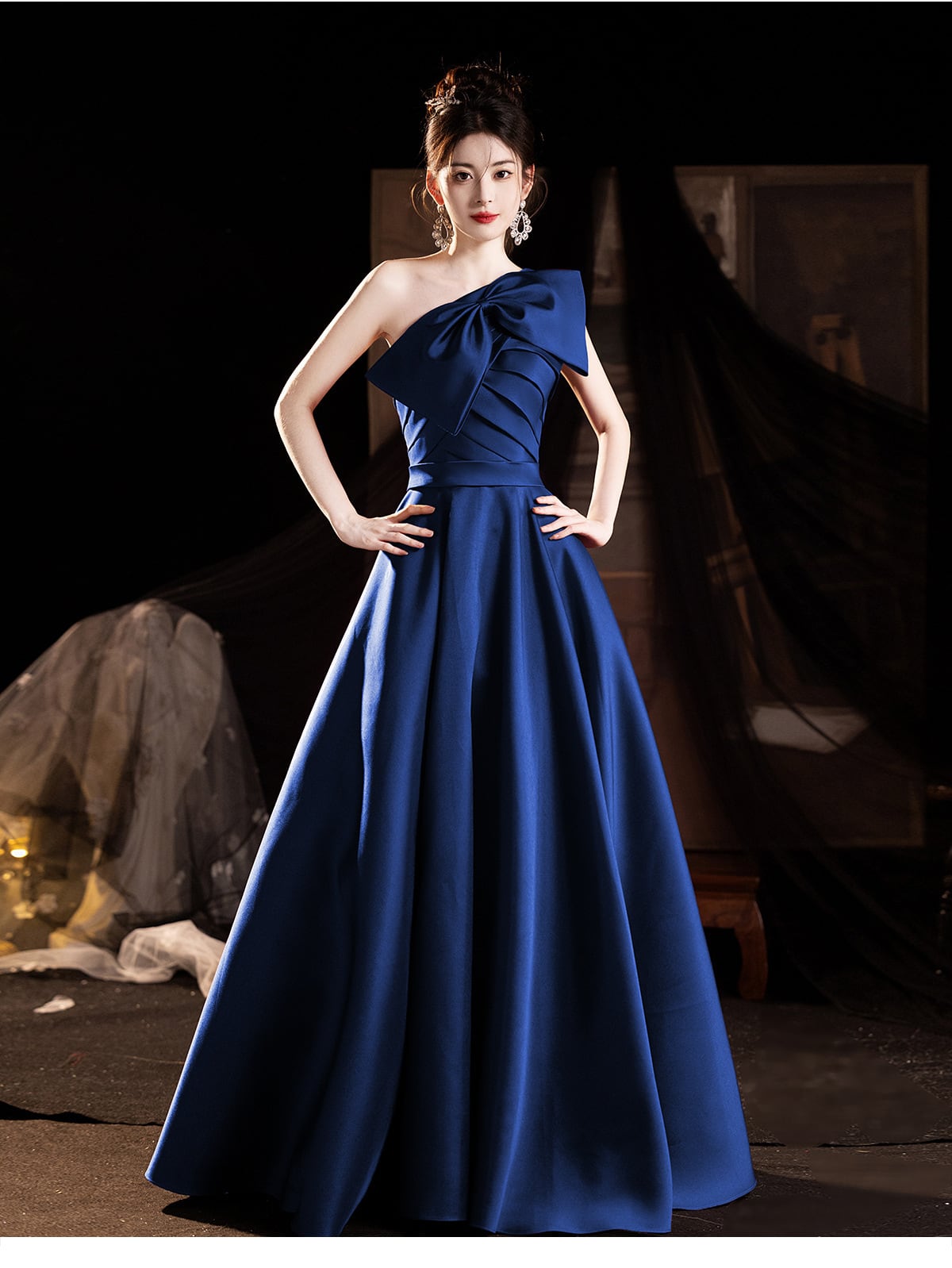 バストの大きなリボンが目を惹くワンショルダーのカラードレス。