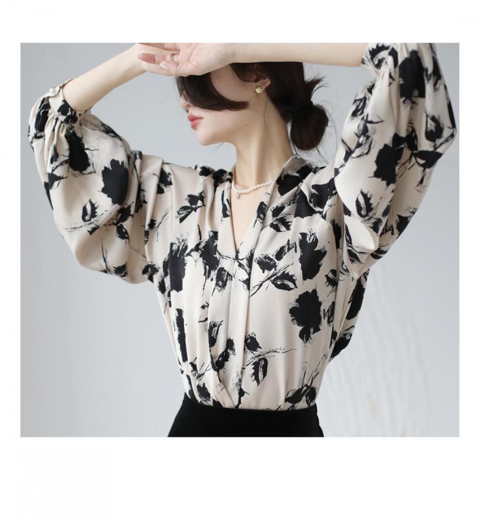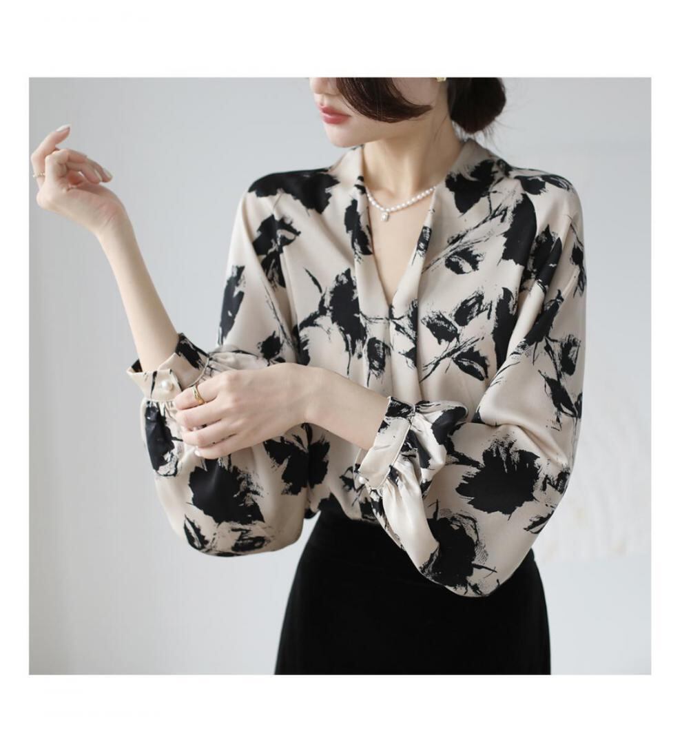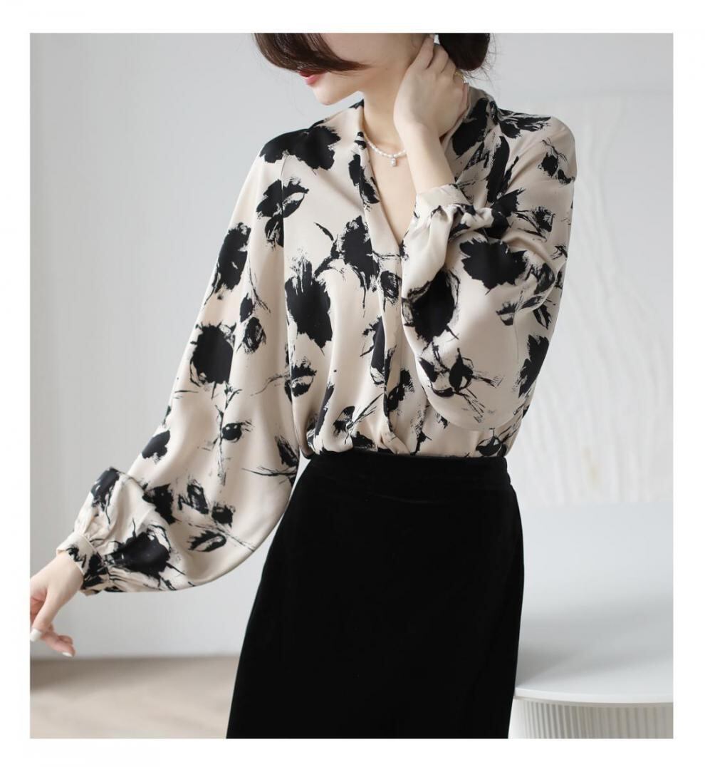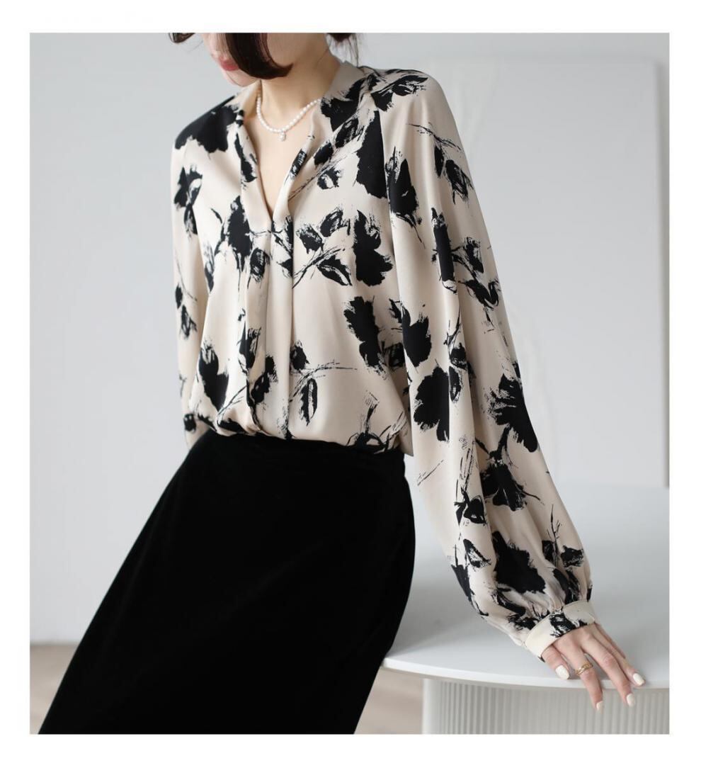 大人エレガントな花柄のボウタイブラウス。