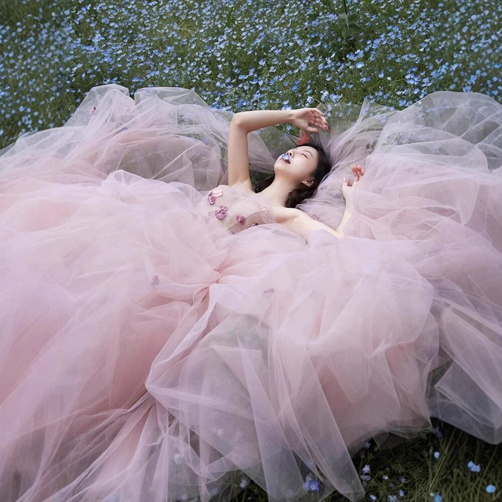 ふんわりボリューミーなチュールスカートが女性らしさを引き立てる。