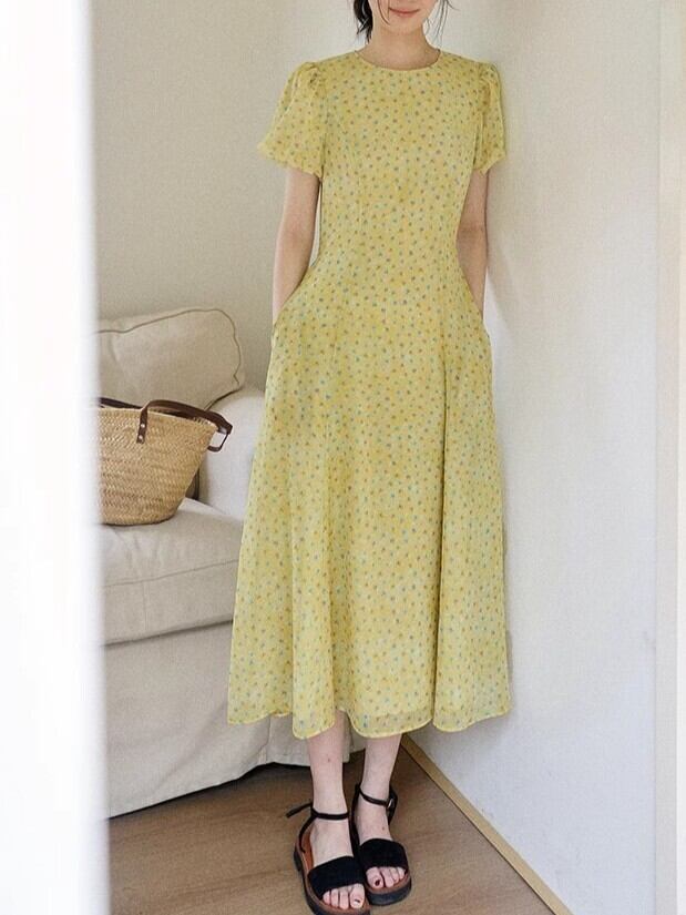 大人可愛いイエローカラーに小花柄のパフスリーブワンピース。