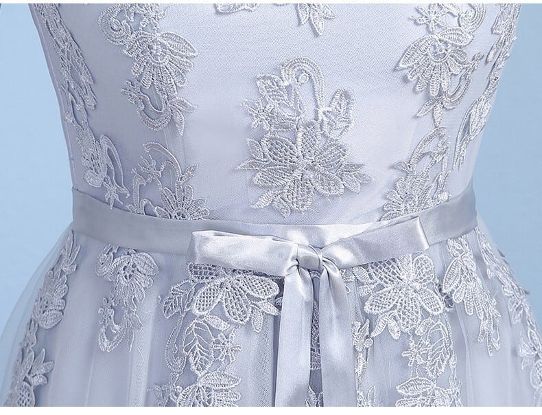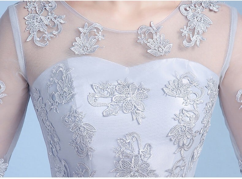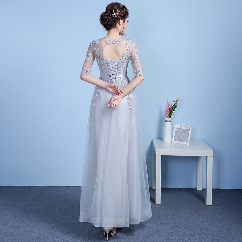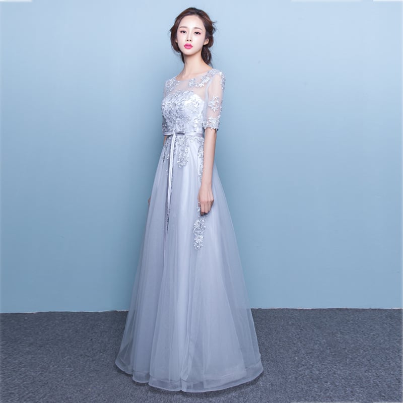 バストとお袖の透け感がエレガントなロング丈のパーティードレス。