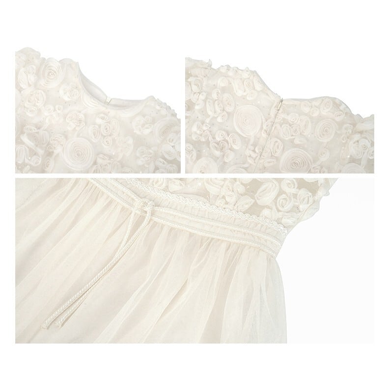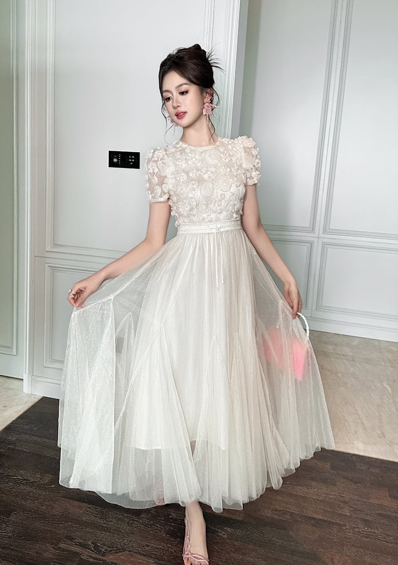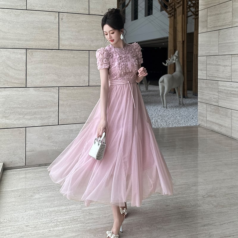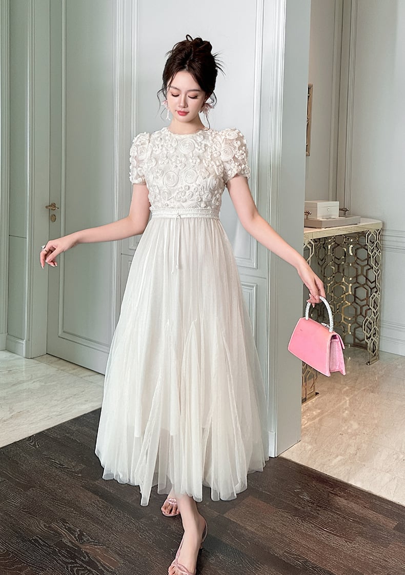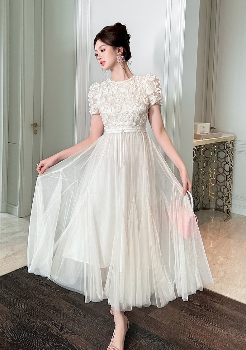 トップの立体花刺繍が可愛らしいパーティードレス。