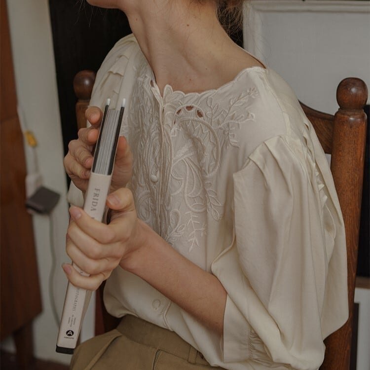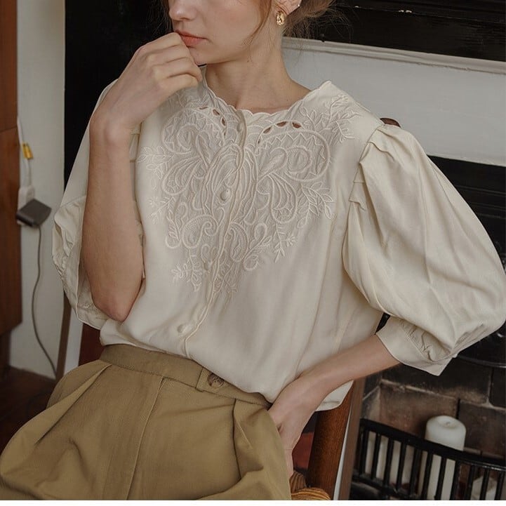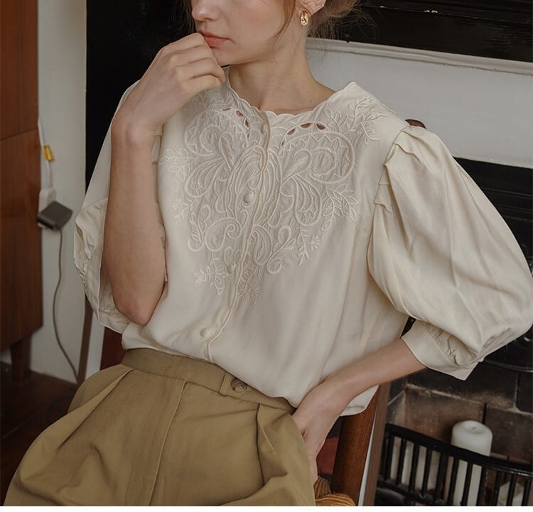 フレンチレトロな花刺繍がエレガントなブラウス。